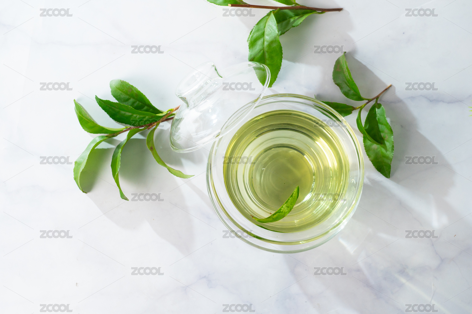 透明玻璃复古茶杯冲泡绿茶的场景,在红木仿古桌面上