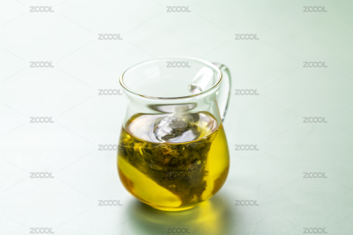 桌面上的杯子里的甘甜可口的金盏菊花茶