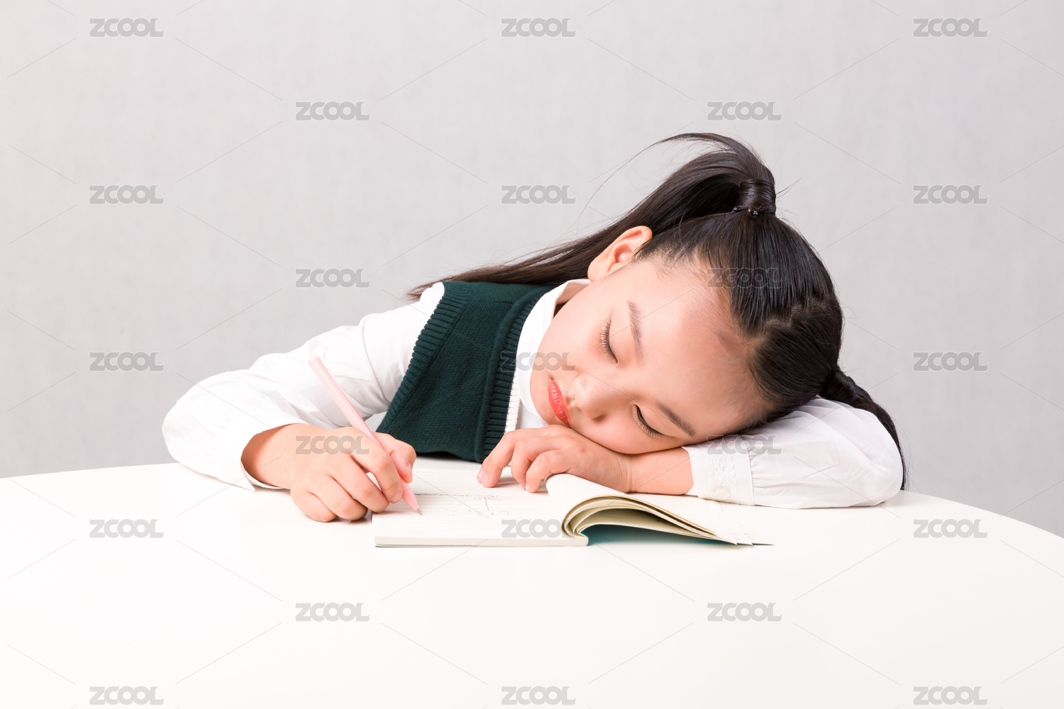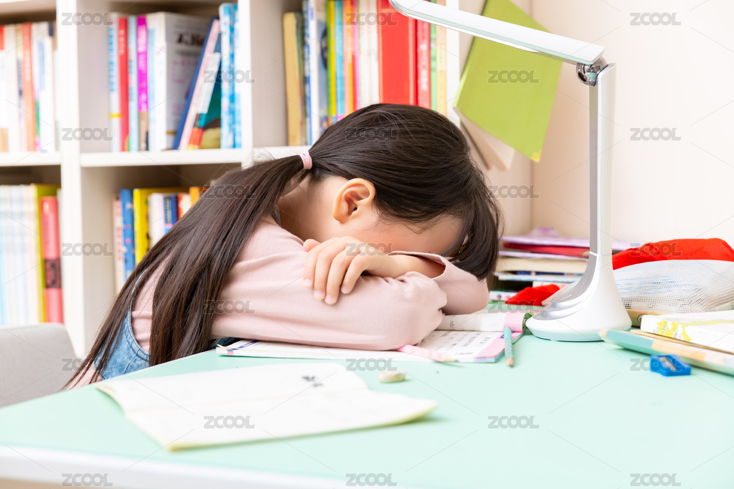 在室内上网课的中国小女孩趴在桌子上睡觉