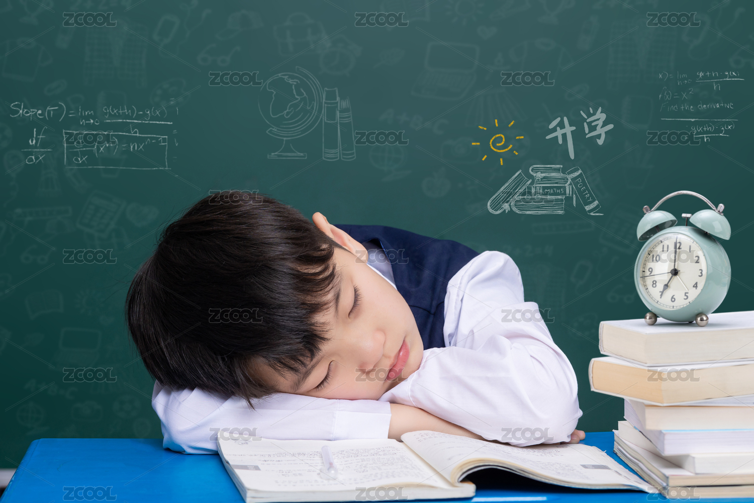 一个中国人爬在书桌上因为过度疲倦劳累而睡着