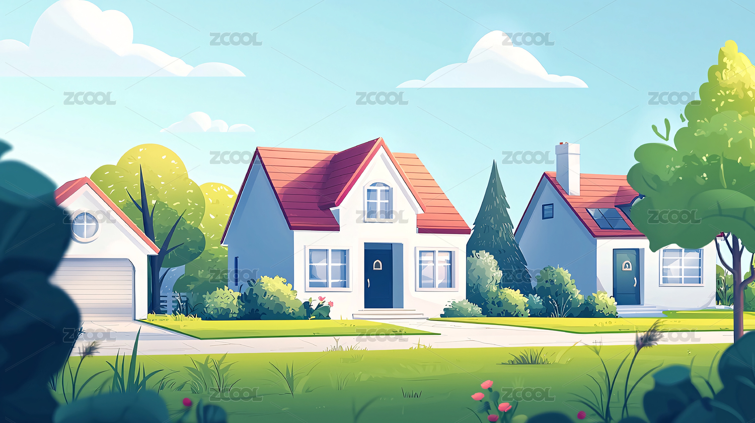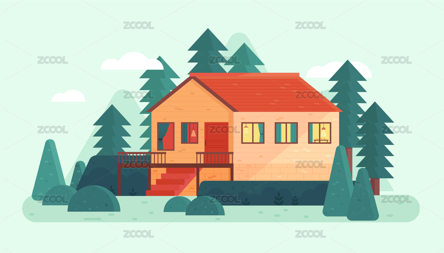 扁平风乡村别墅红砖绿瓦建筑自然风景插画
