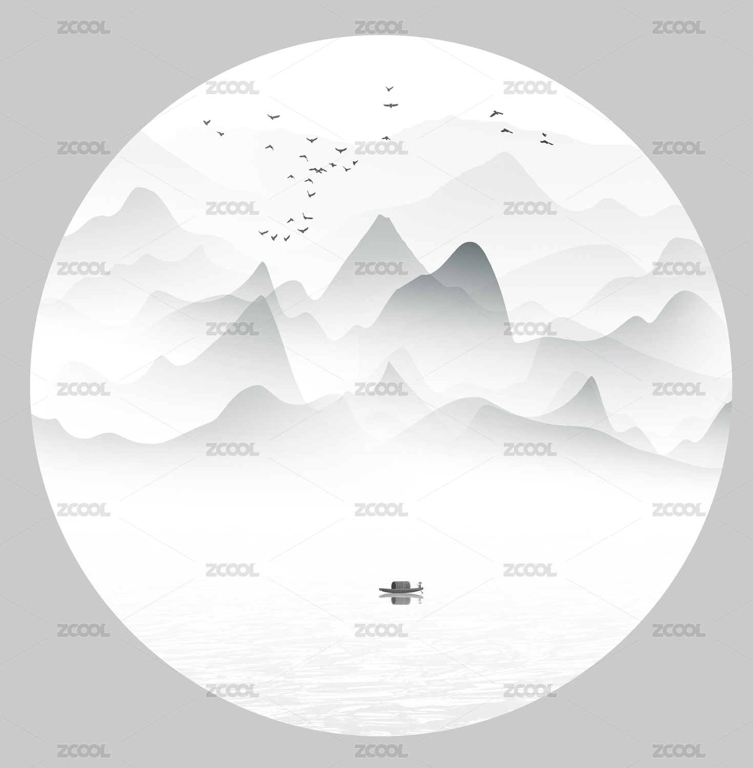 圆形禅意山水新中式水墨装饰矢量分层背景图