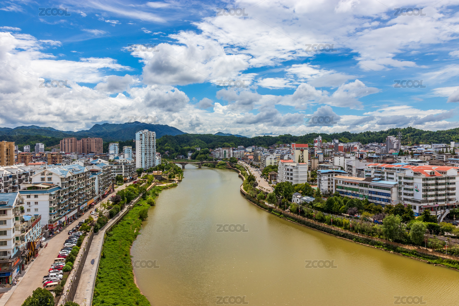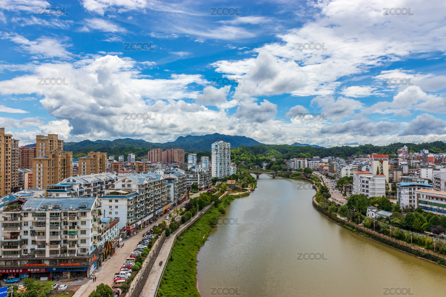 晴好天气下俯拍福建长汀汀江两岸的民居