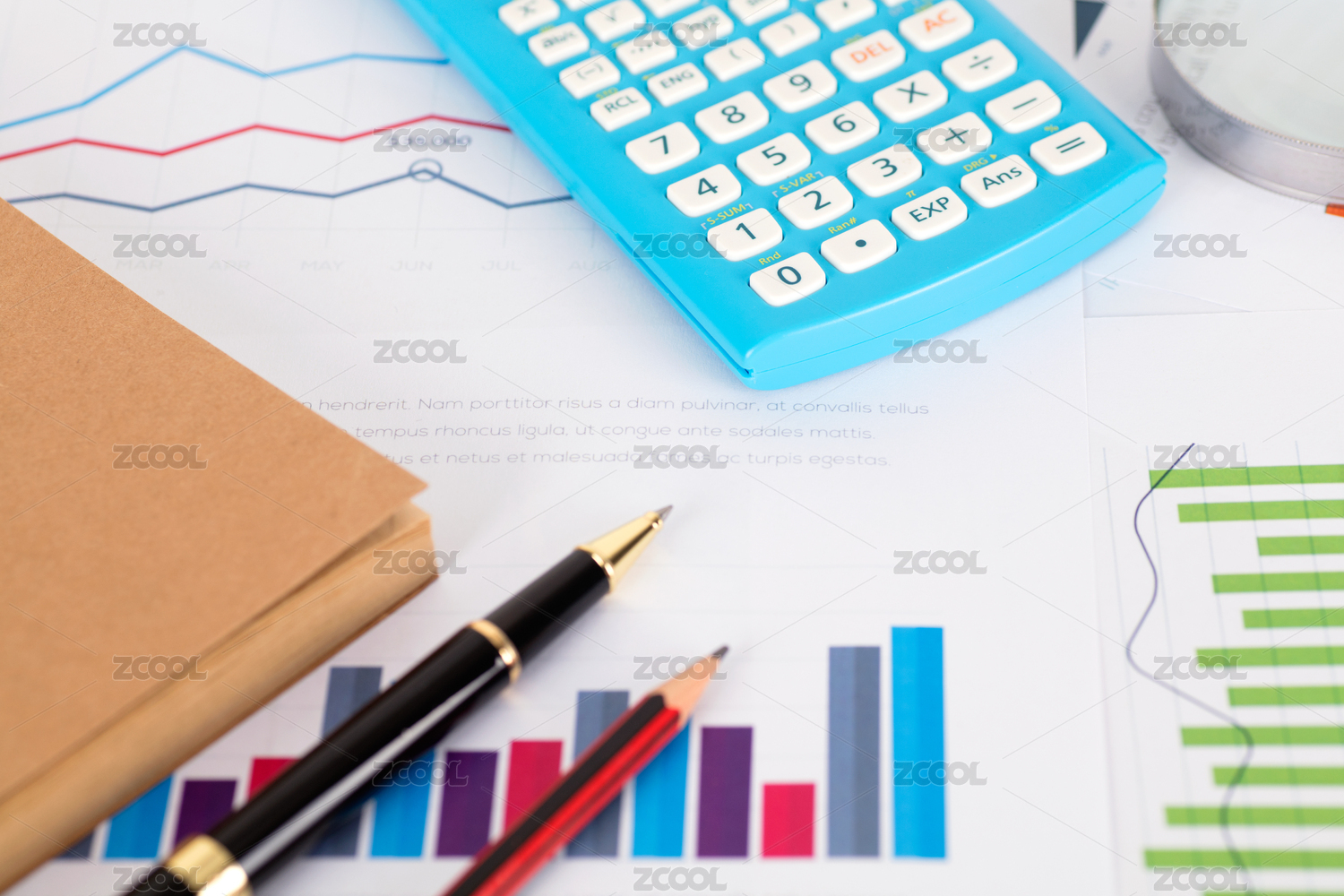 金融经济数据增长概念——放在财务数据报表上的钢笔和计算器