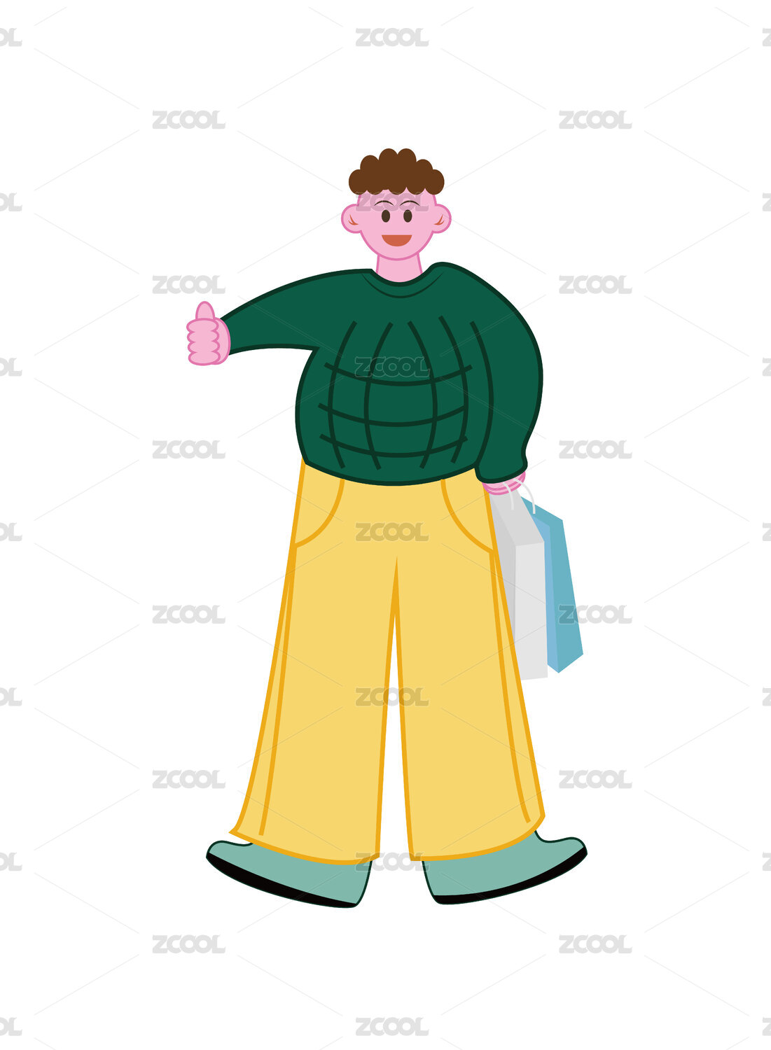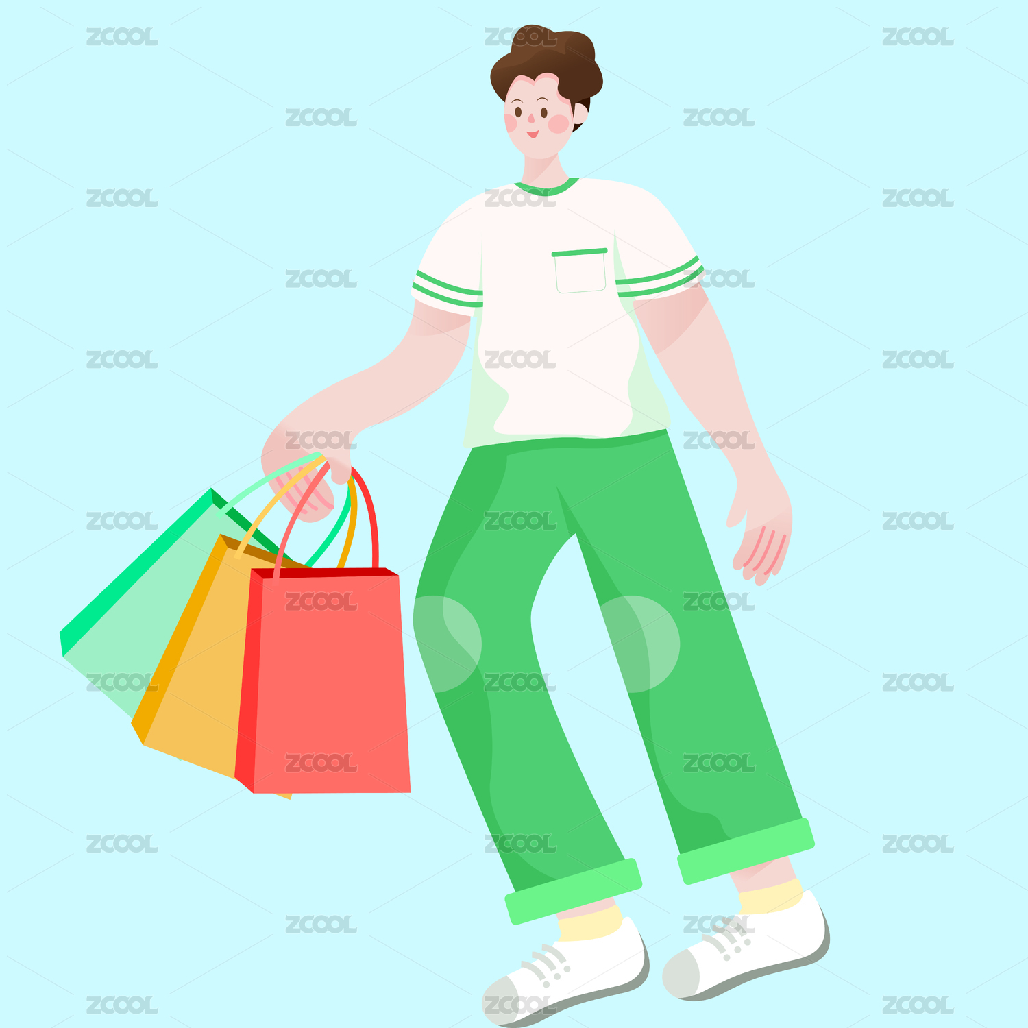 一个成年男性在有荷叶的背景上拿着购物袋购