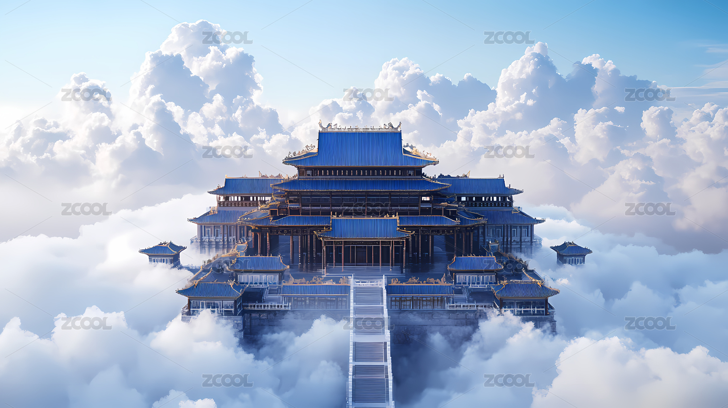 宫殿,建筑,东方建筑风格,多层的塔楼,飞檐,精致的装饰,天空,云朵,太阳,巨大的月亮