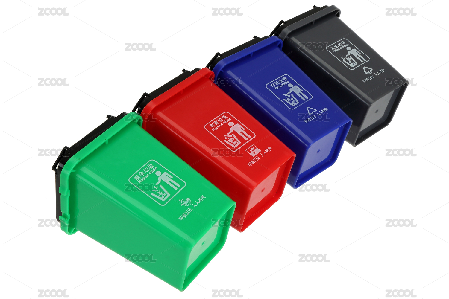 白色背景中的四个垃圾分类垃圾桶