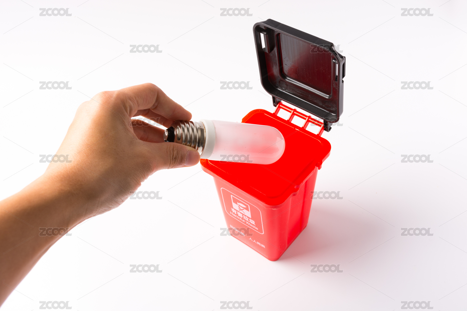 向红色有害垃圾桶里扔垃圾