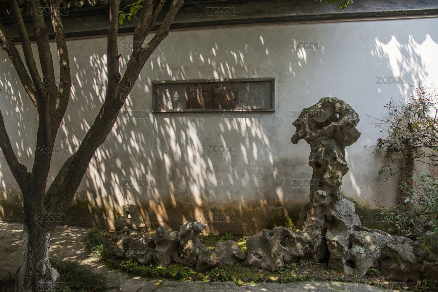 江南水乡苏州园林中式庭院建筑窗户前的太湖