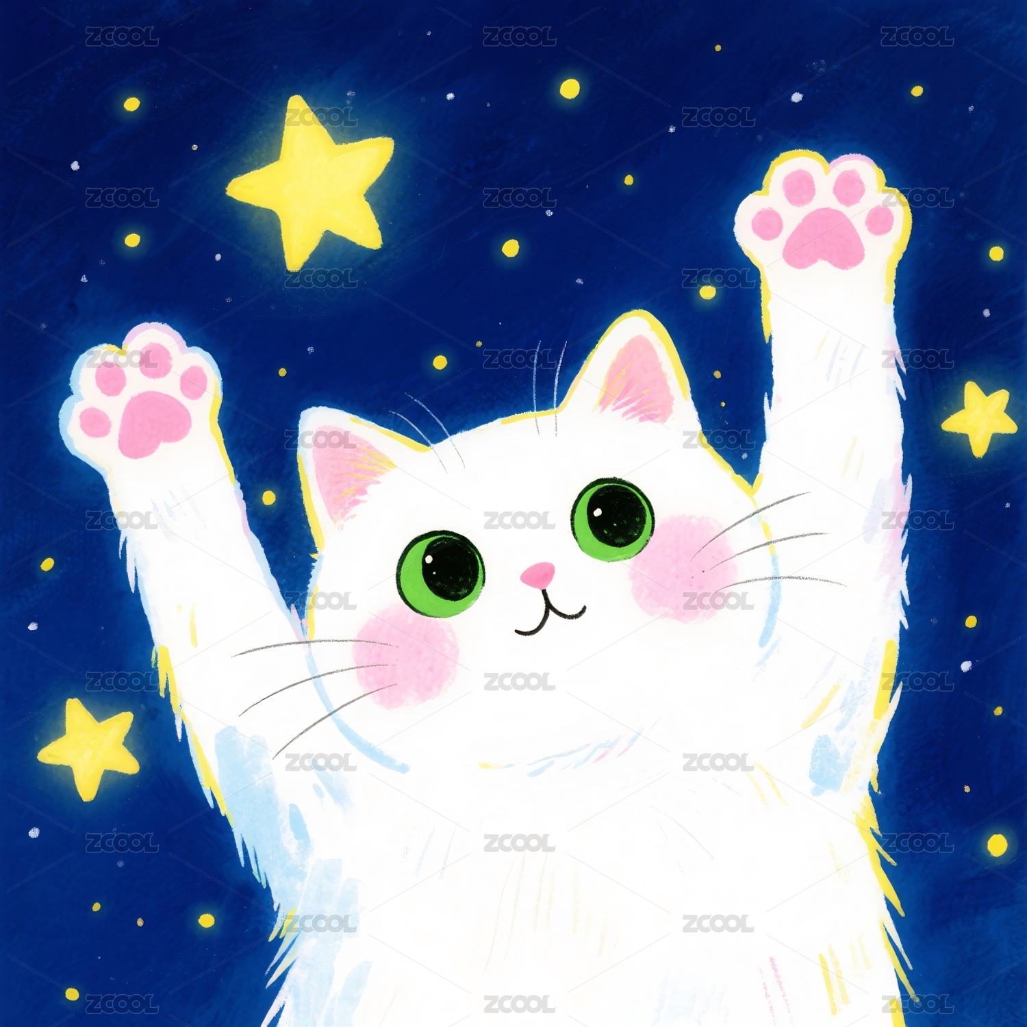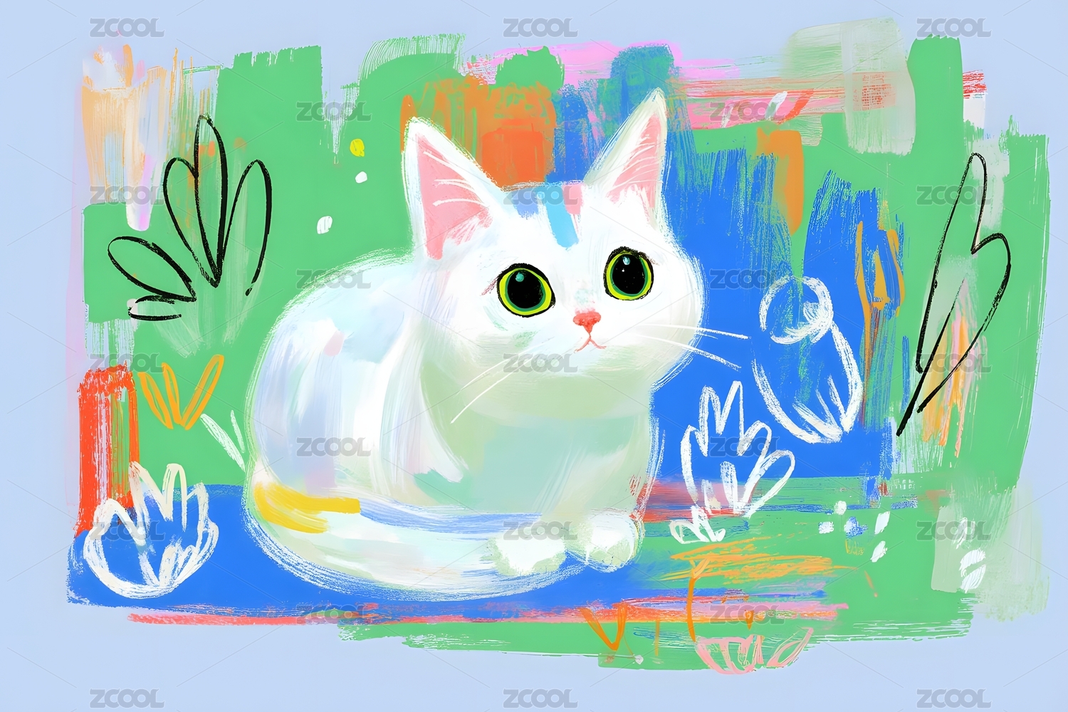 白色,猫咪,招手,水彩画,蓝色背景,毛茸茸,可爱,宠物,艺术,绘画