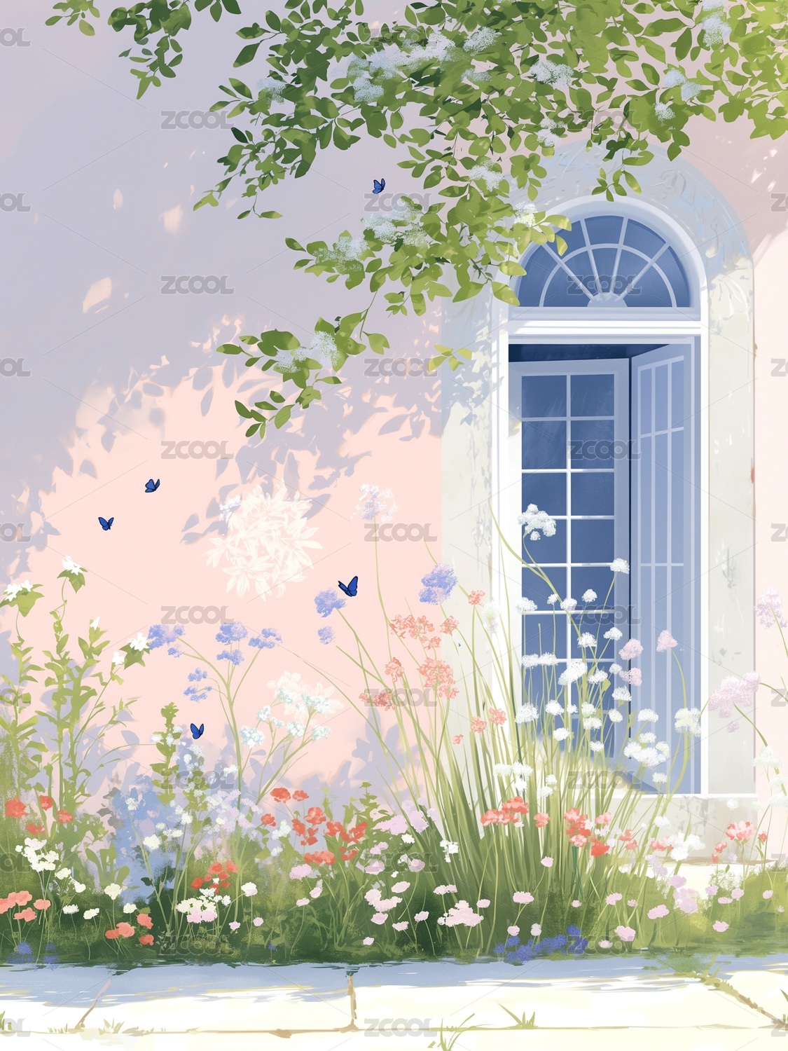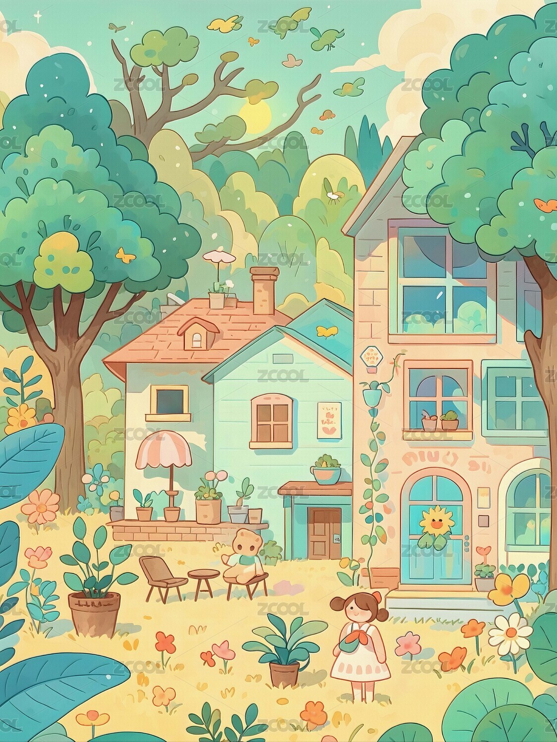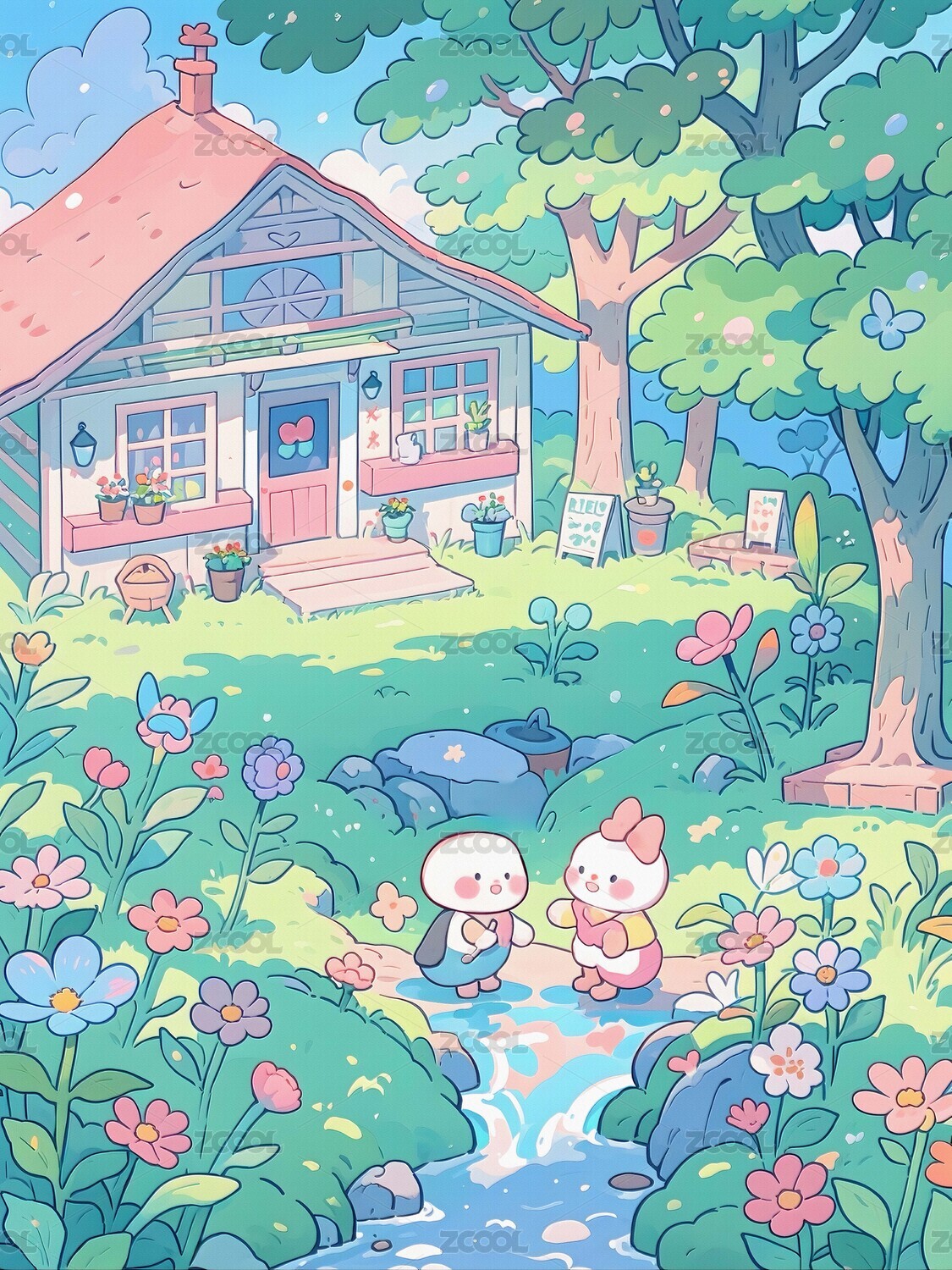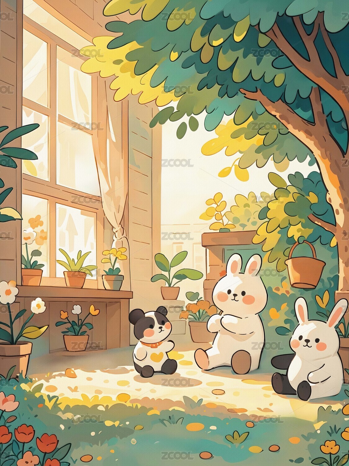 萌宠,花园,动物,可爱,治愈,卡通,插画,春日,阳光,温暖
