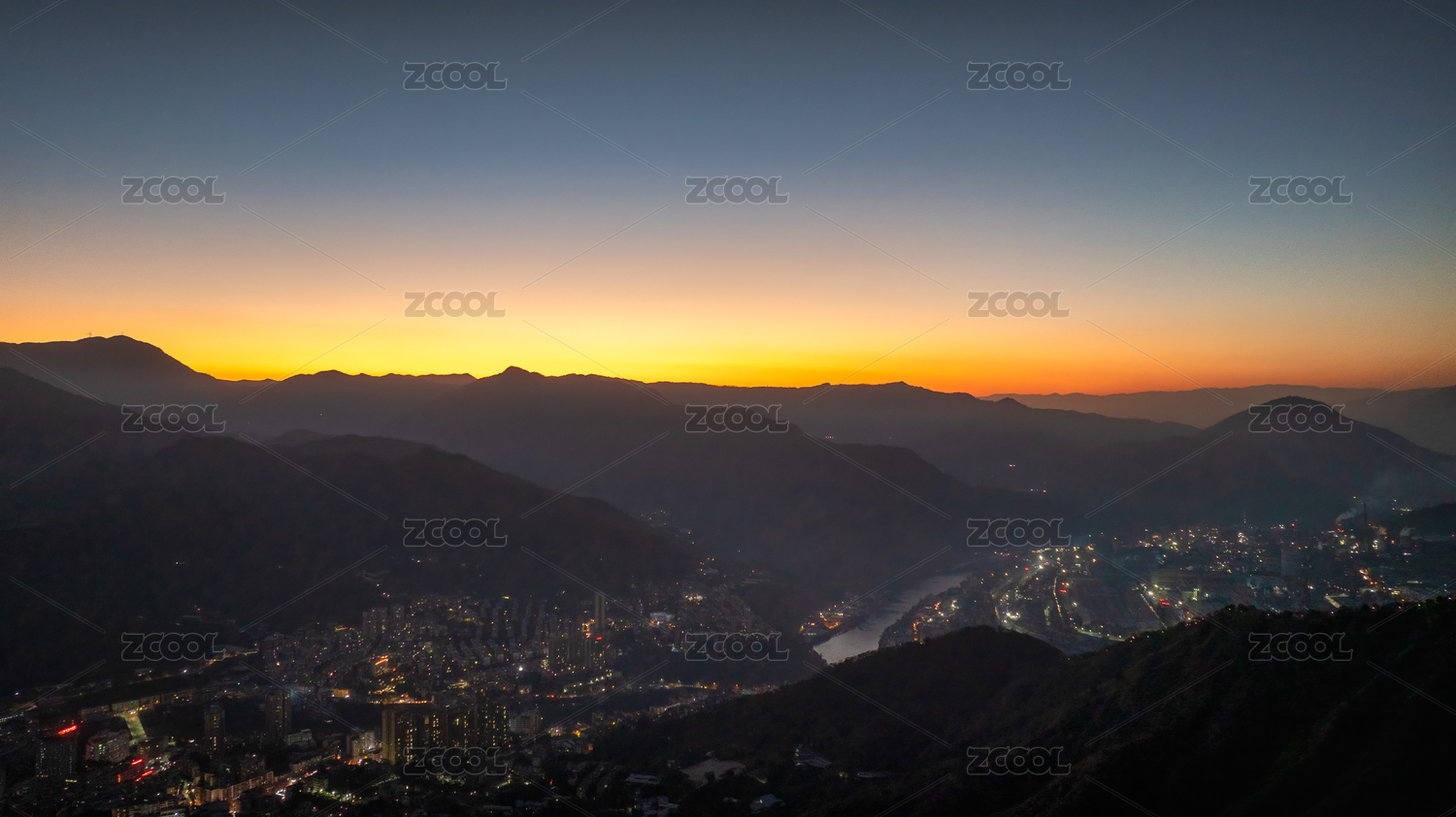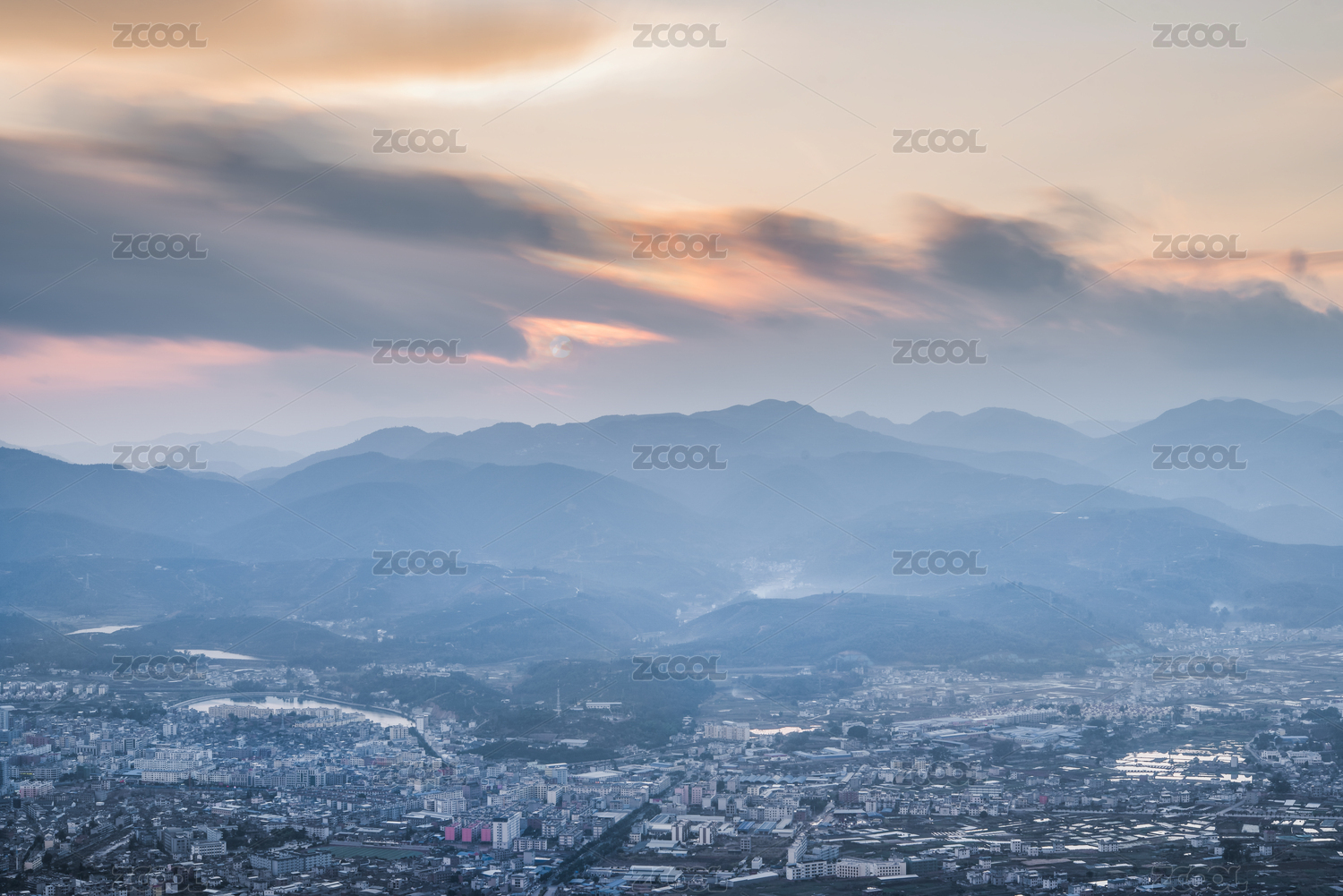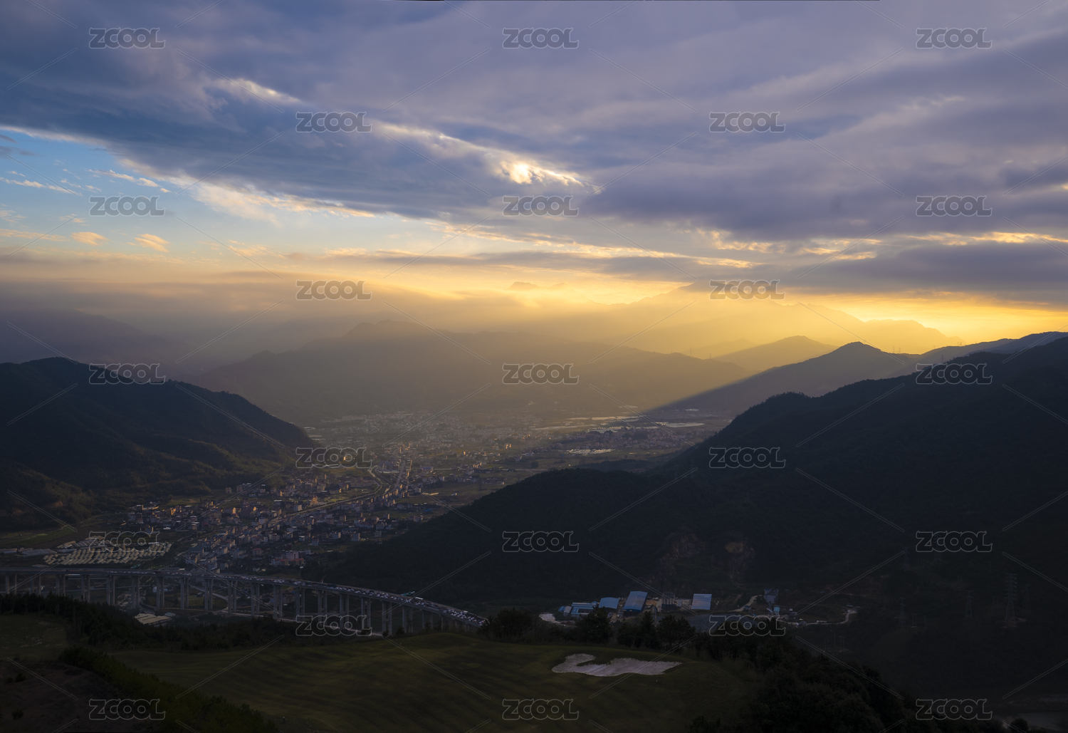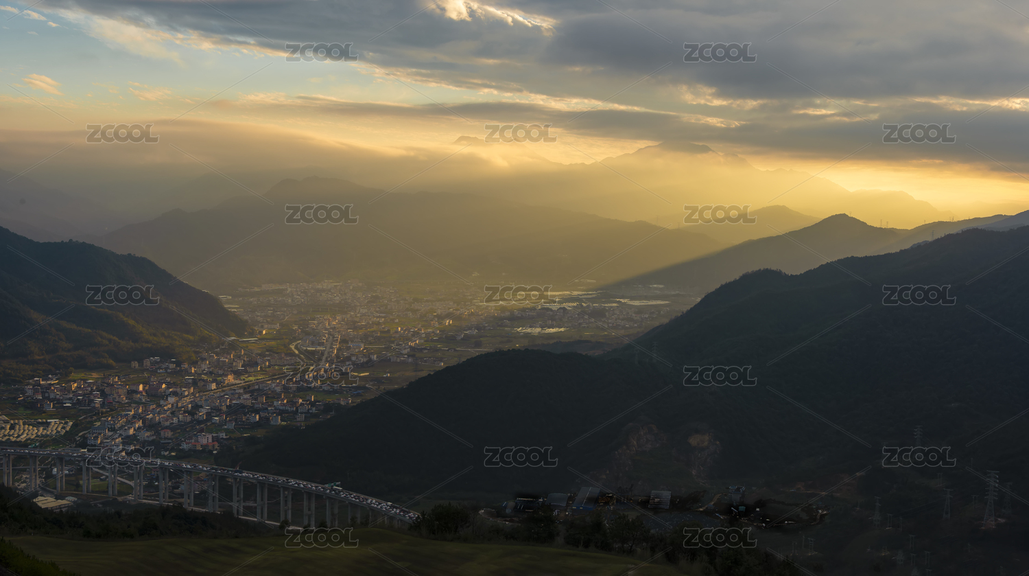 夕阳的余辉投射在山谷间的村镇,中国福建龙岩小池