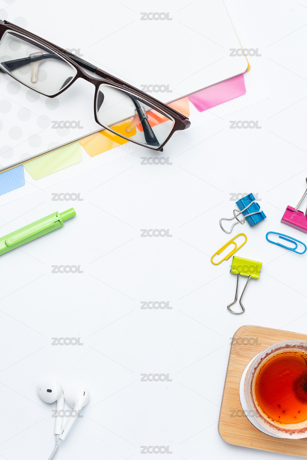白底办公桌上摆放的彩笔、笔记本眼镜等文具