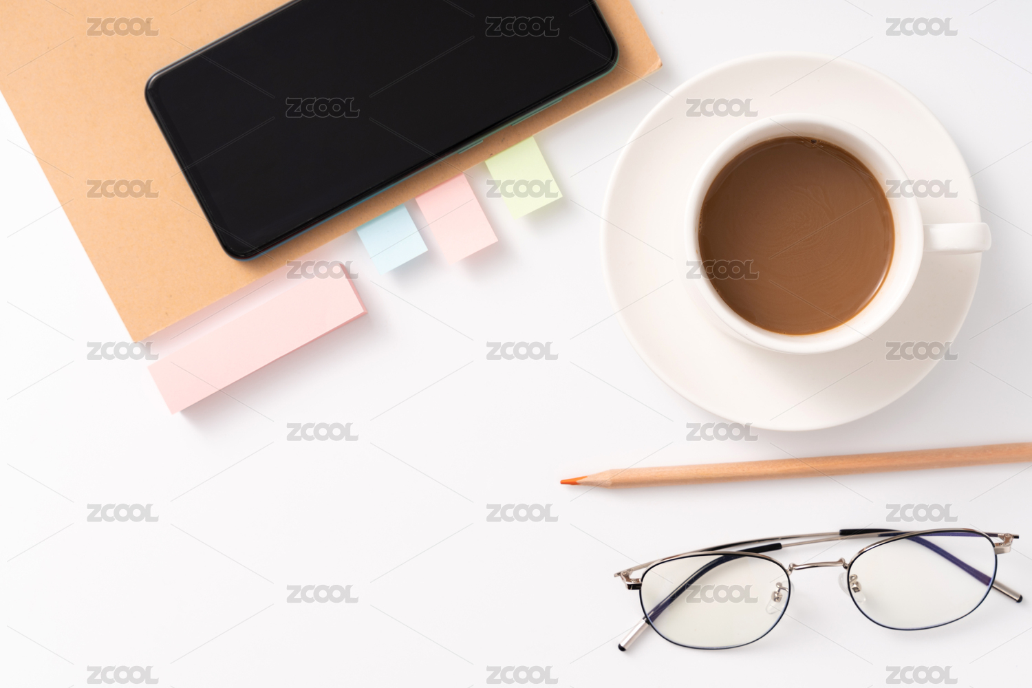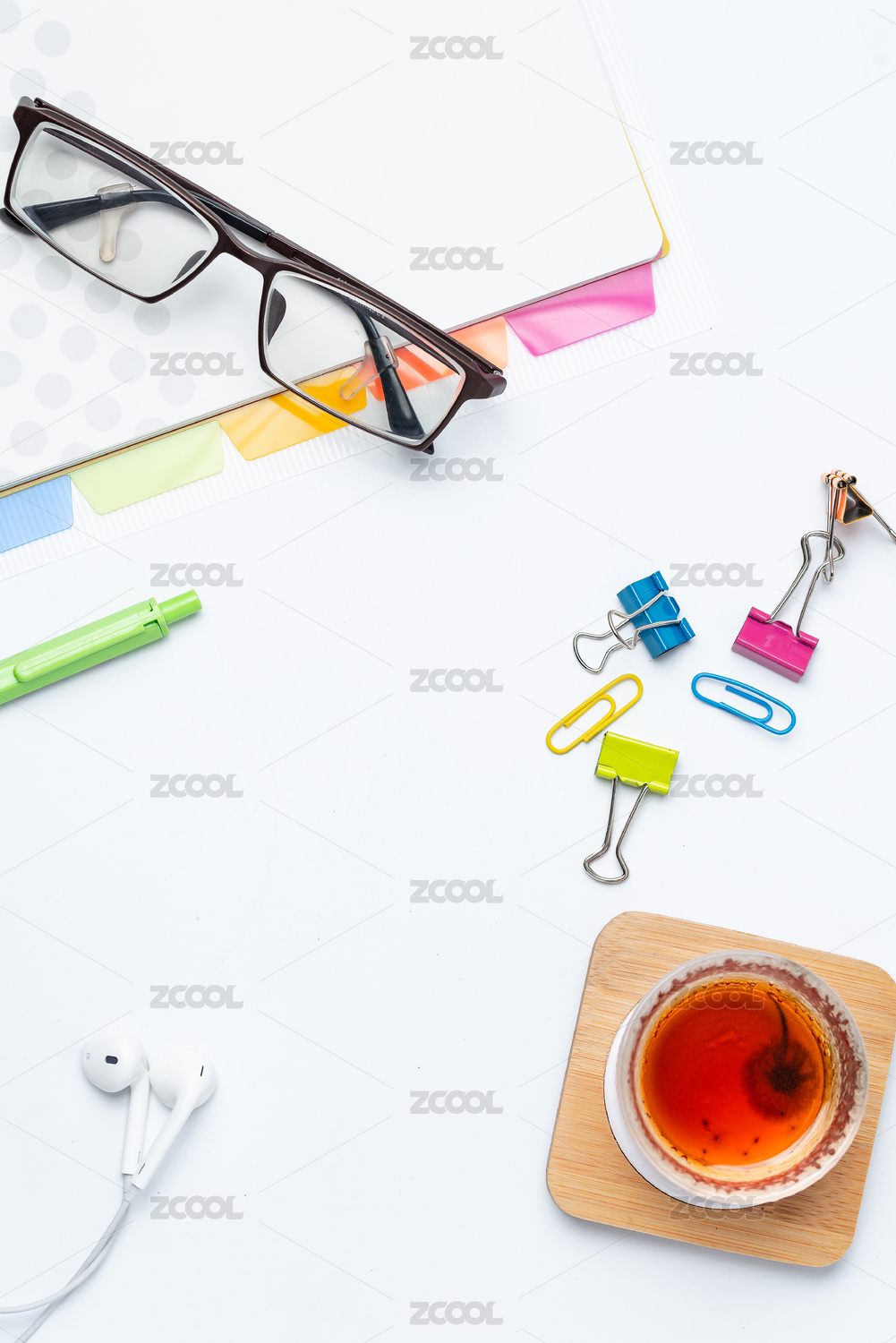 白底办公桌上摆放的彩笔、眼镜、茶杯等
