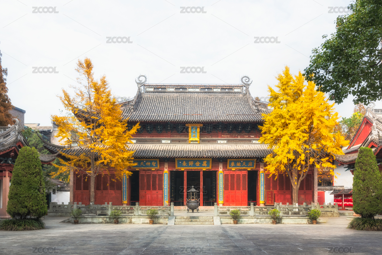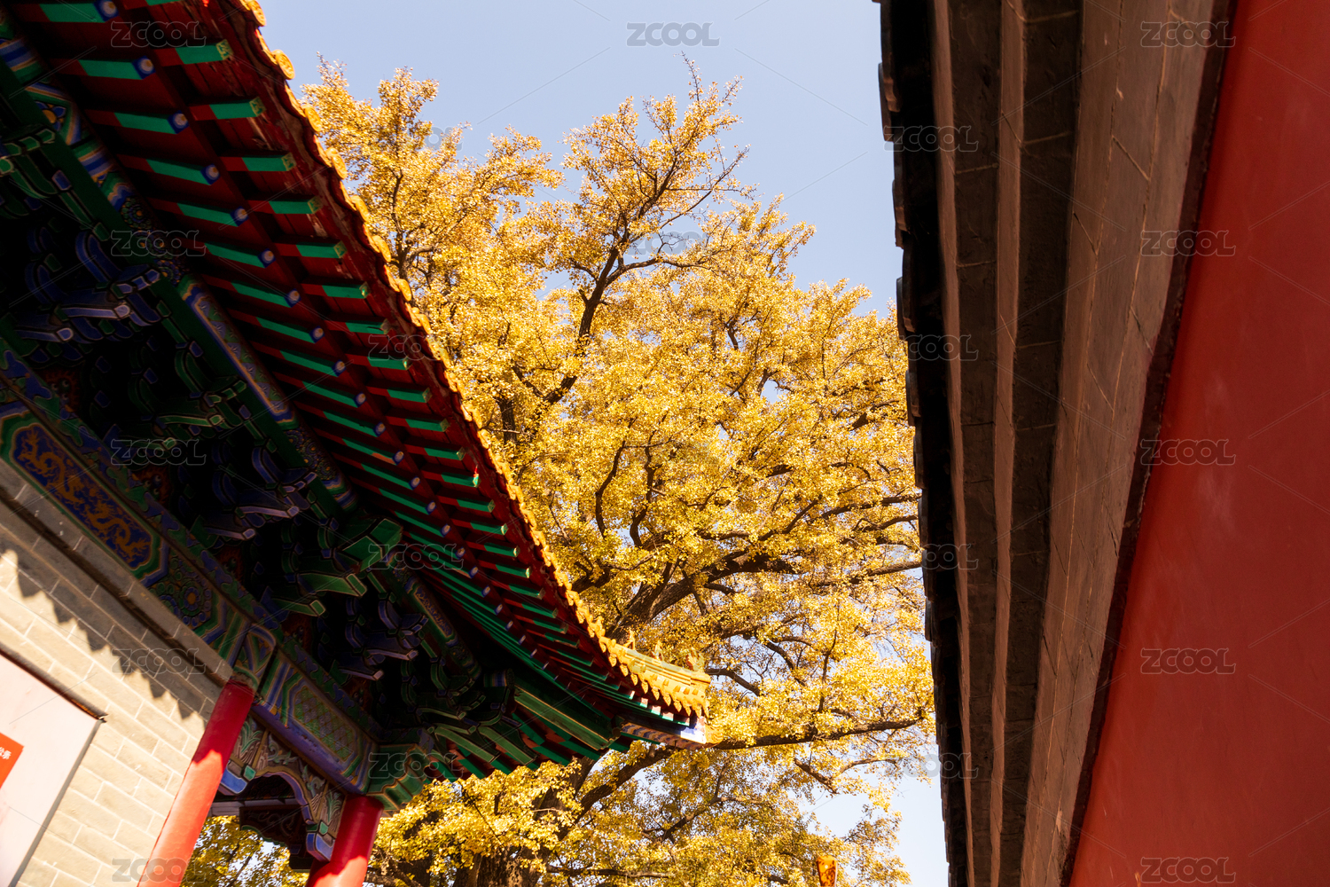 四川省成都市大慈寺秋季金黄色银杏树下的寺庙古建筑细节图