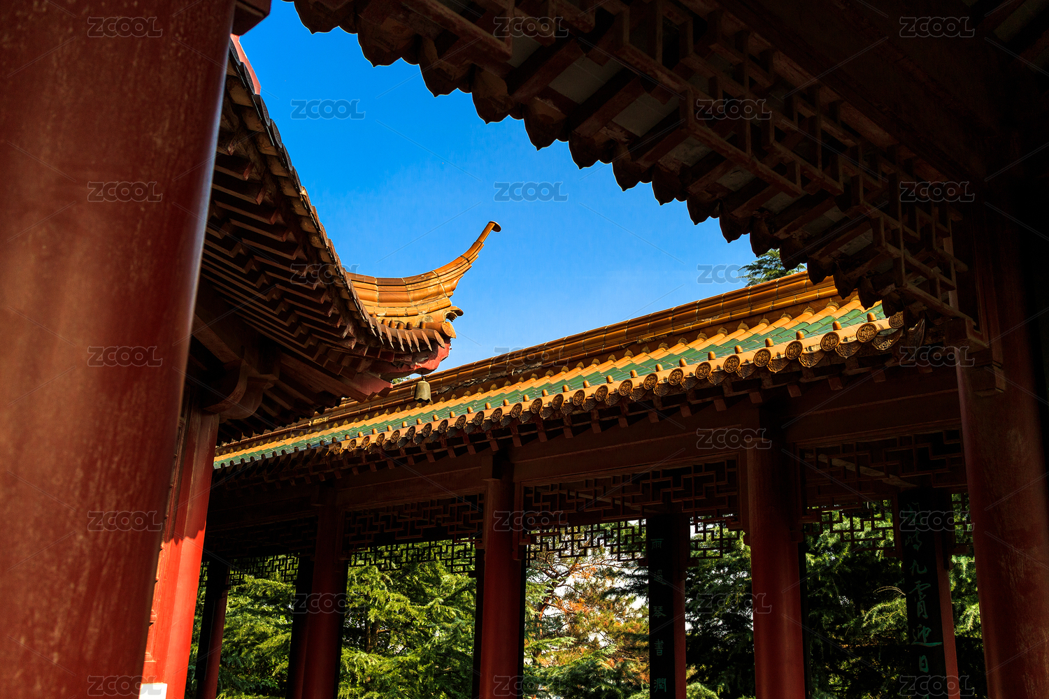 秋天树木前的古建筑飞檐斗角,南京朝天宫