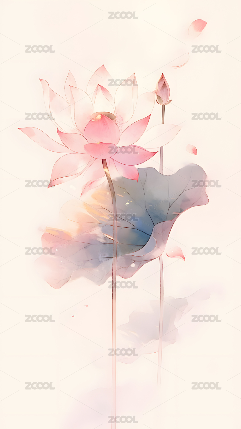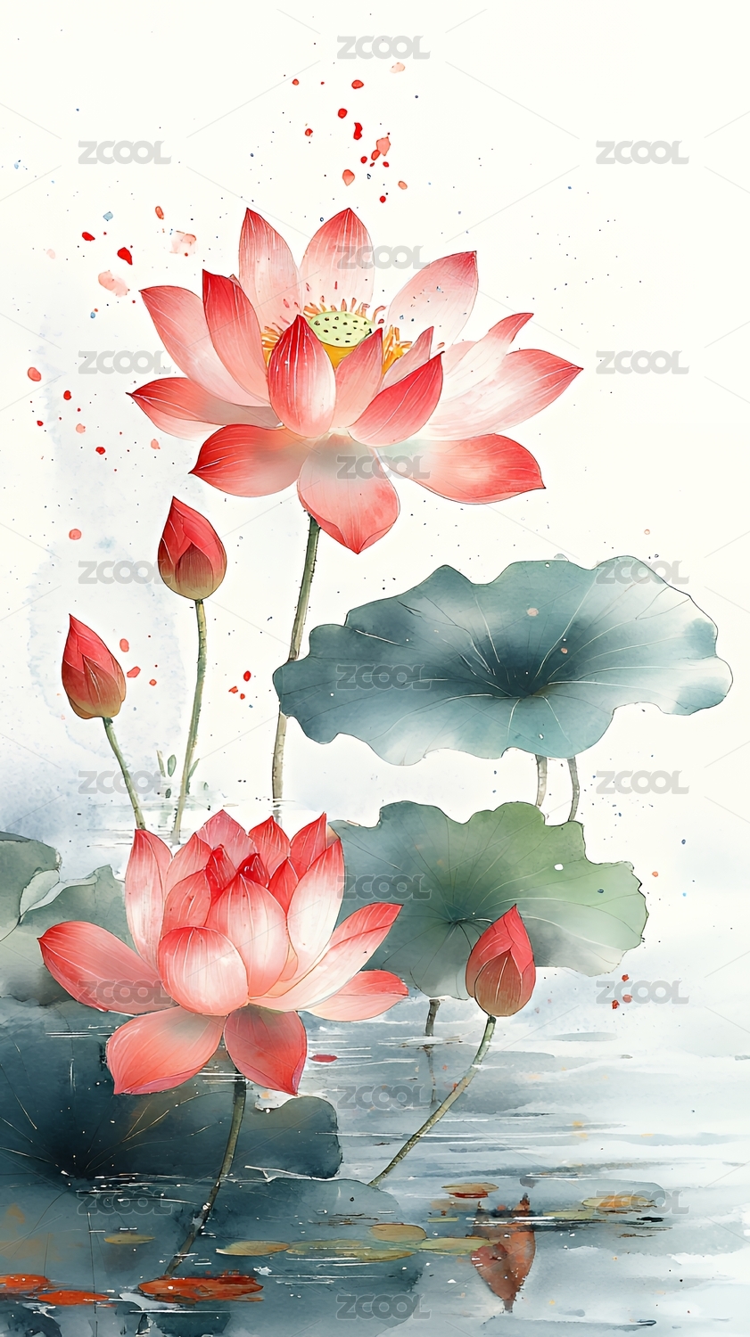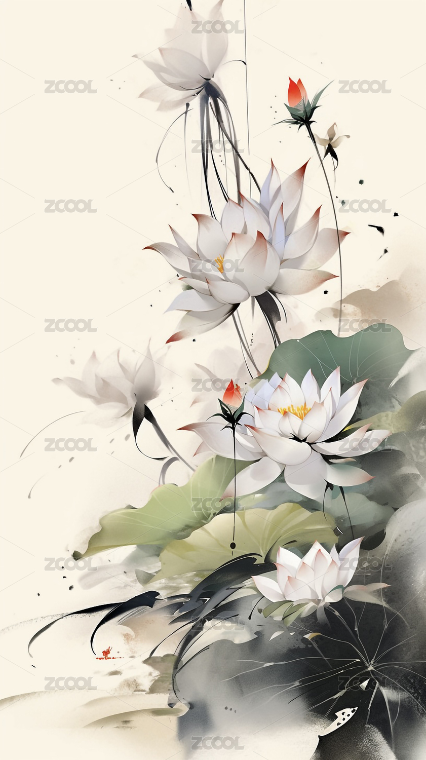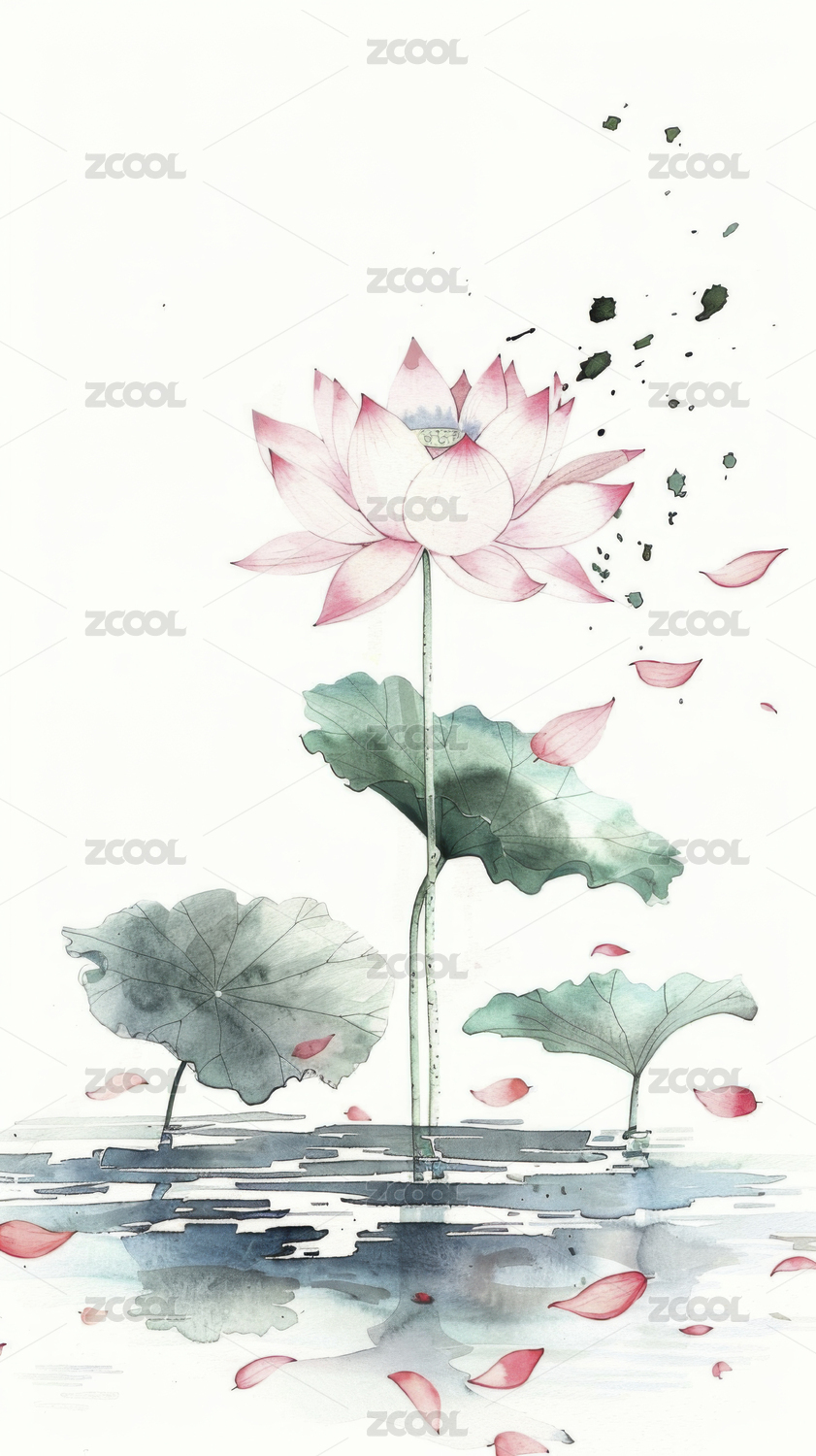 植物荷花国风水墨淡雅插画
