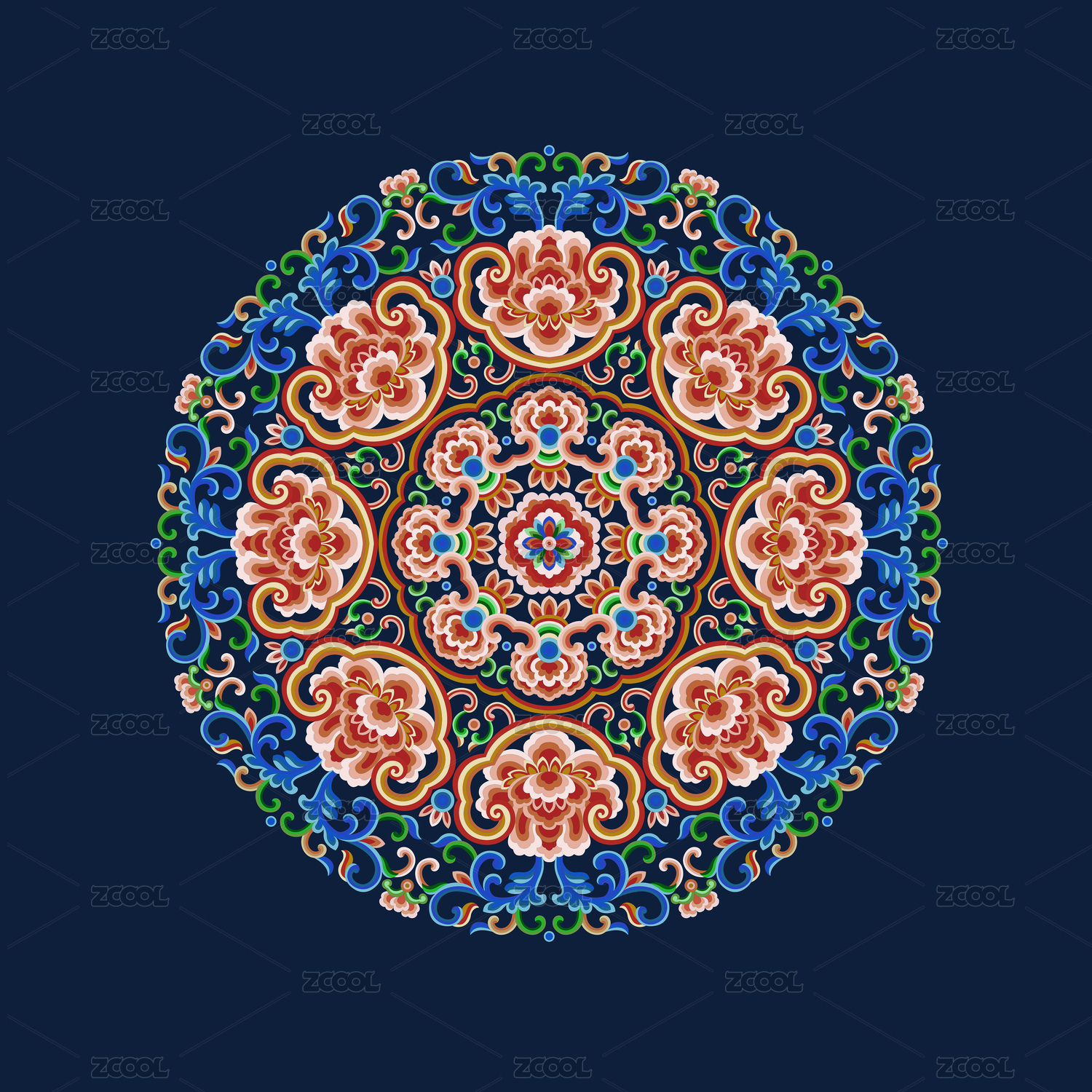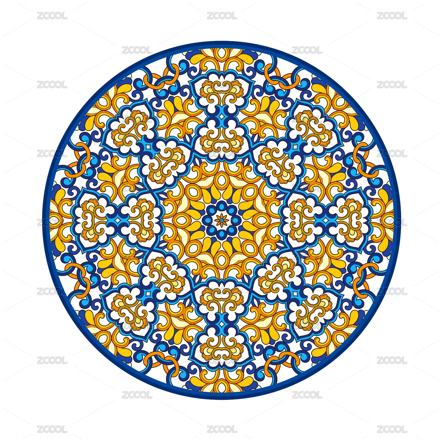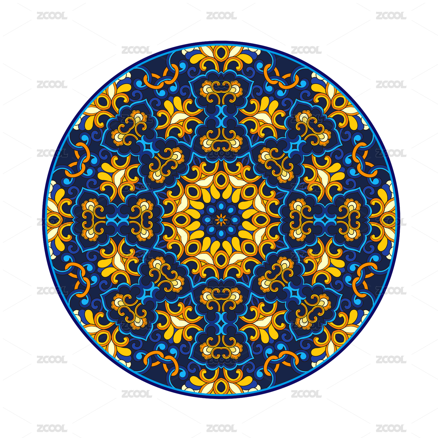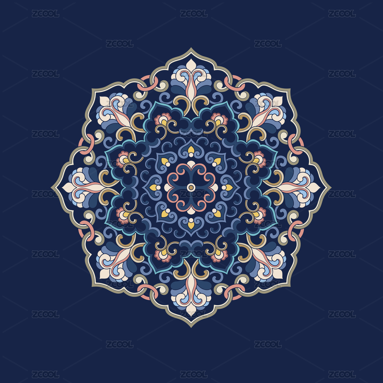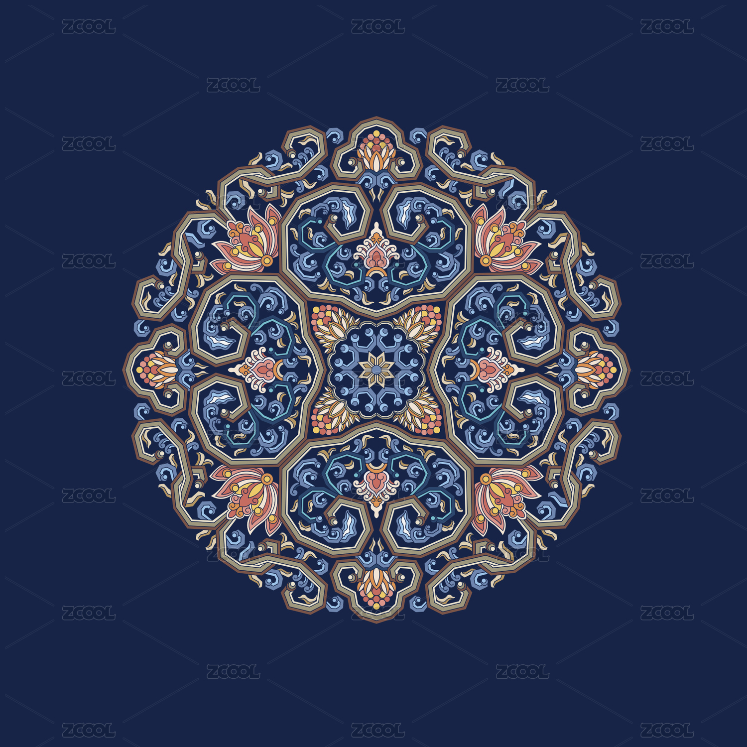 圆形的传统花纹装饰图案,蓝色渐变背景