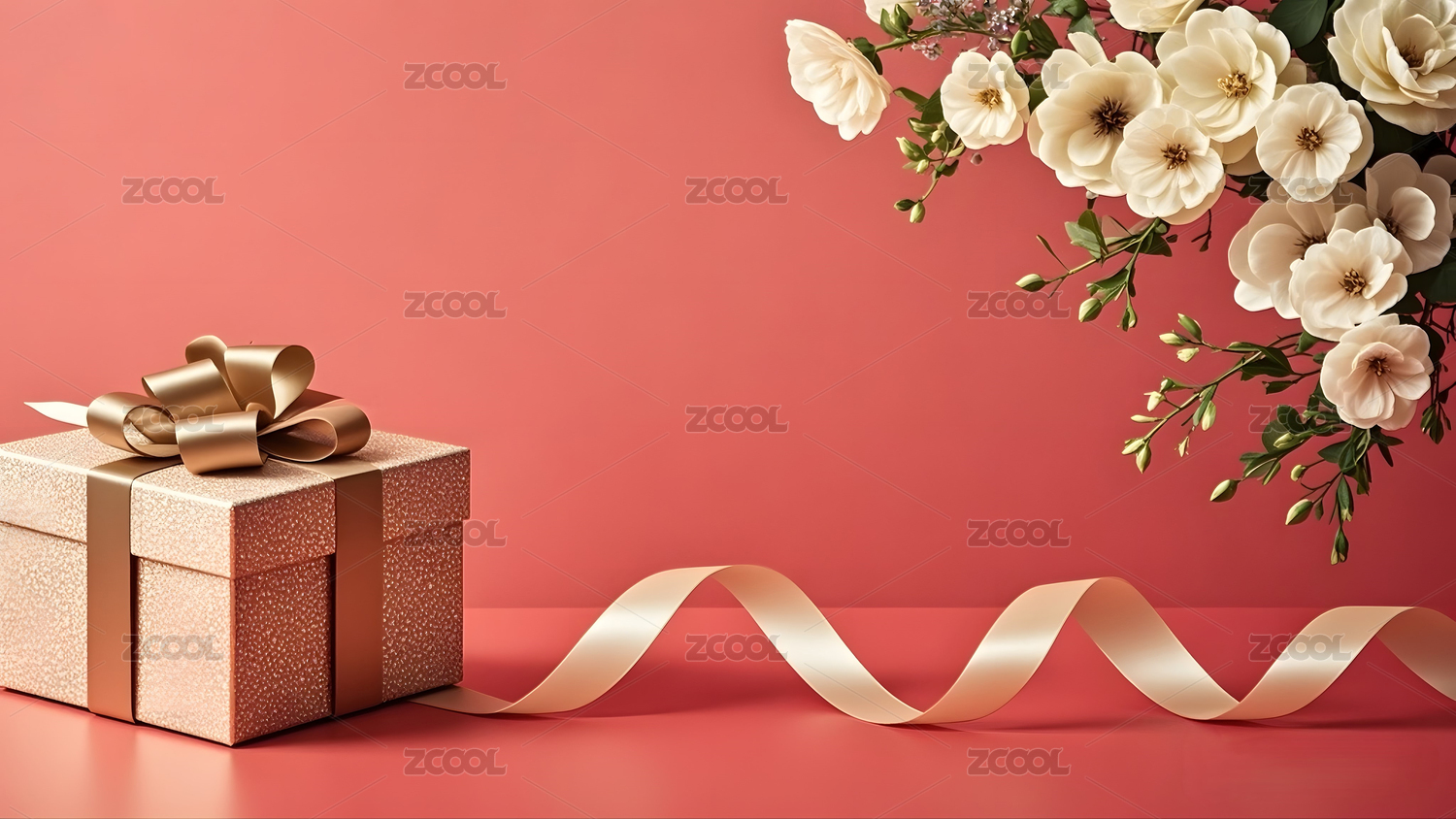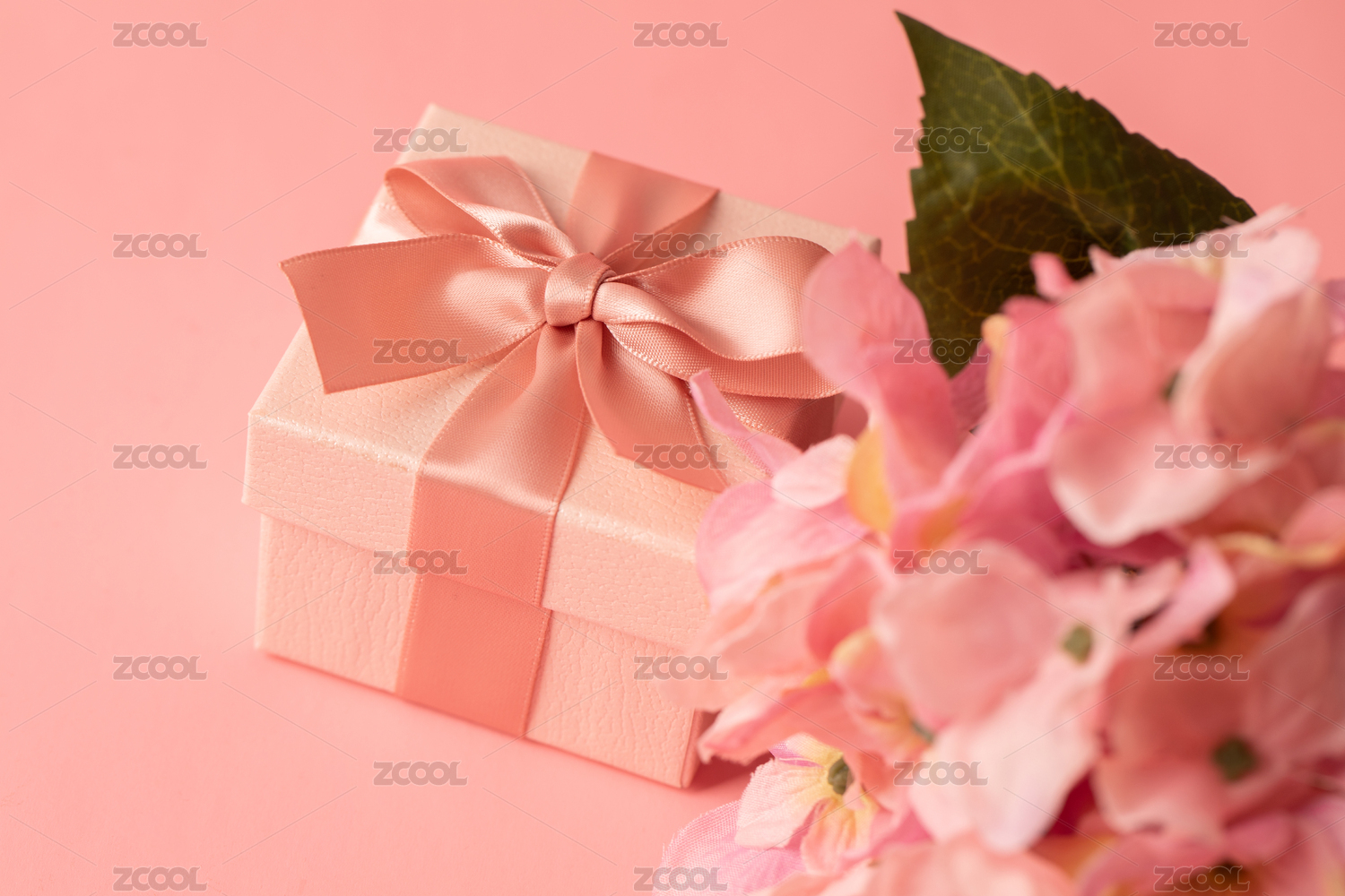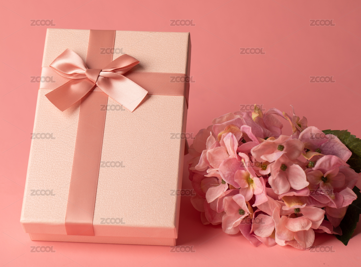 粉色留白背景上的爱心礼物盒和玫瑰花