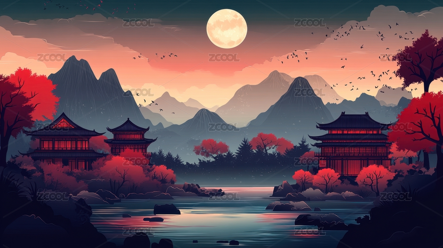 国潮梦幻山水淡彩国风插画
