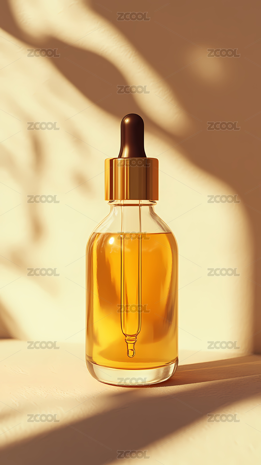 透明玻璃瓶中的精华液置于柔和光影中