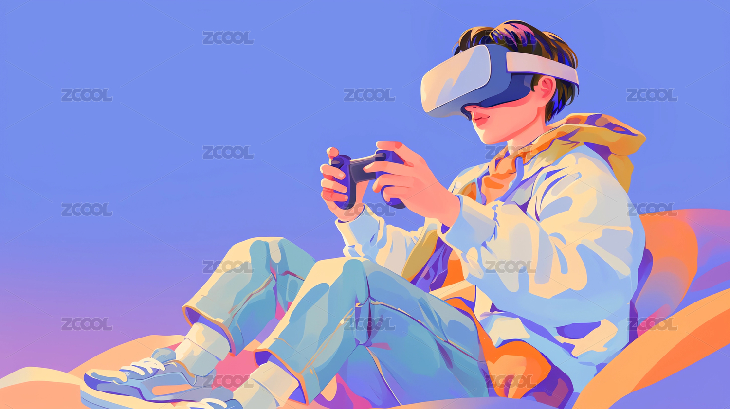 插画,横构图,留白,背景,壁纸,青年,独自,VR眼镜,游戏,手柄