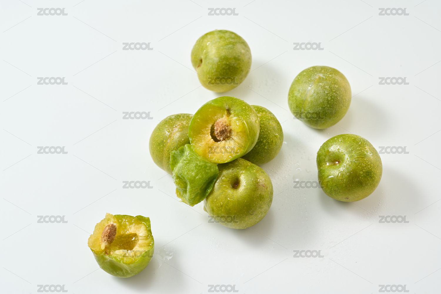 一堆新鲜的翠绿色脆李放在白色背景板上