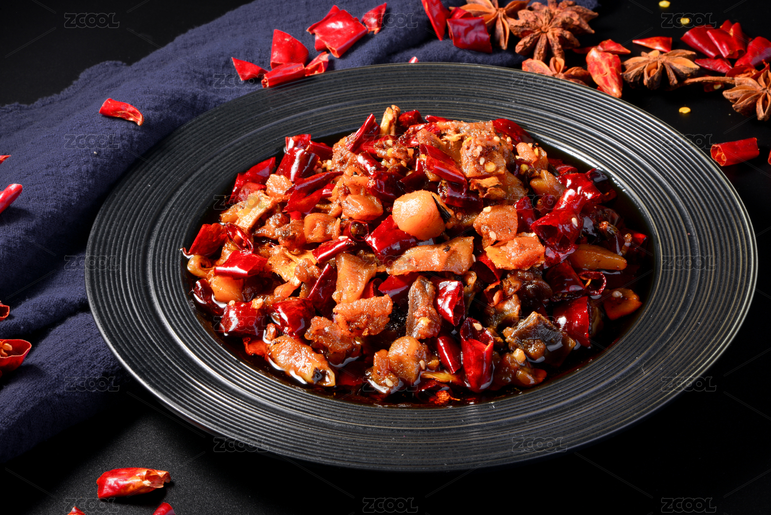 深色木板背景上摆放的辣炒鸡肉