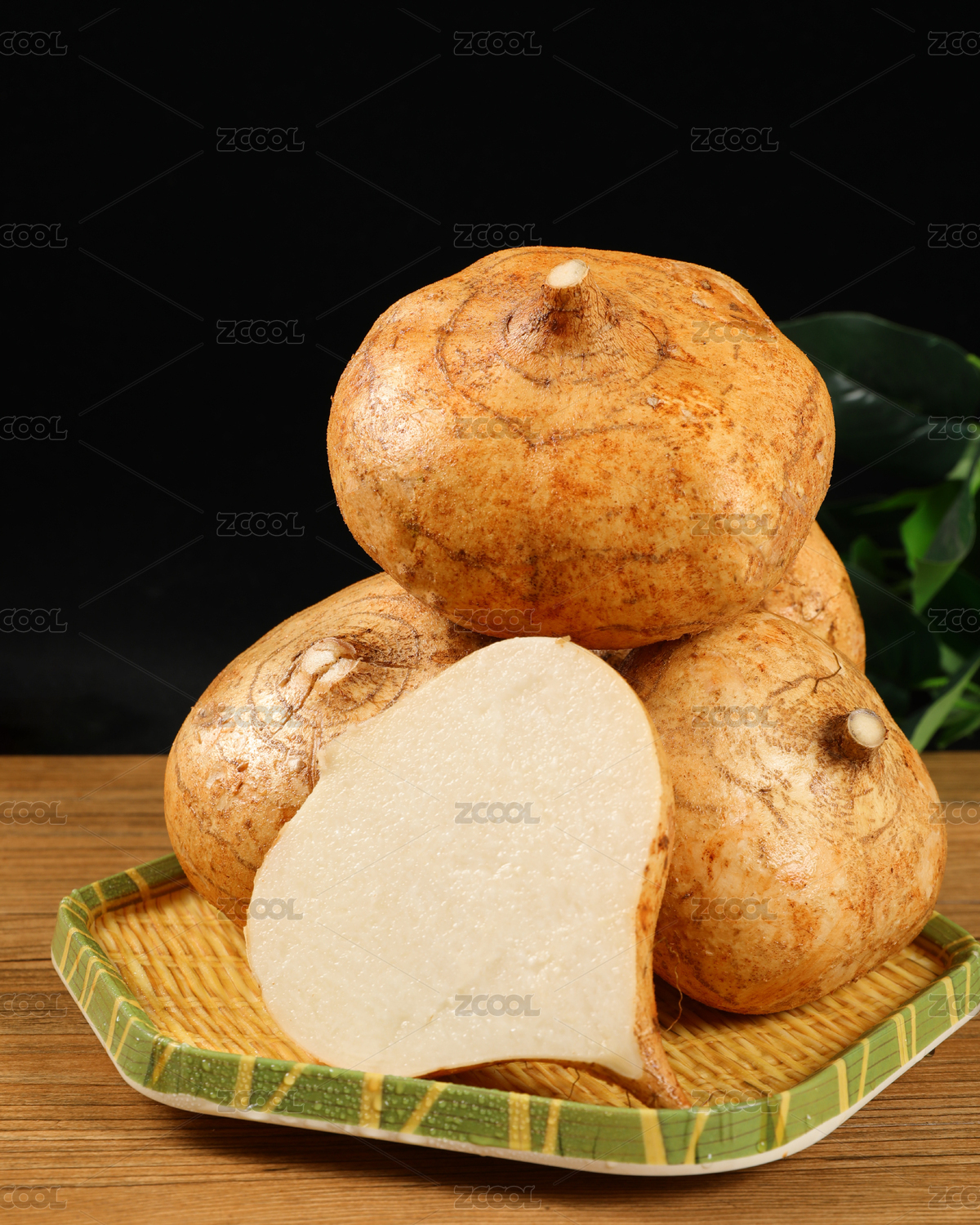 木底上蓝子里的云南金秤砣山药和切面的山药