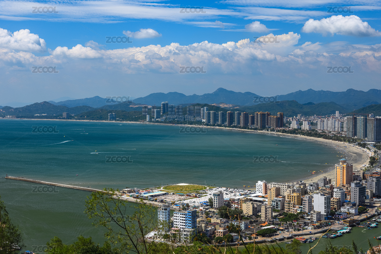 远眺惠州双月湾的沙滩和海滨上的建筑群