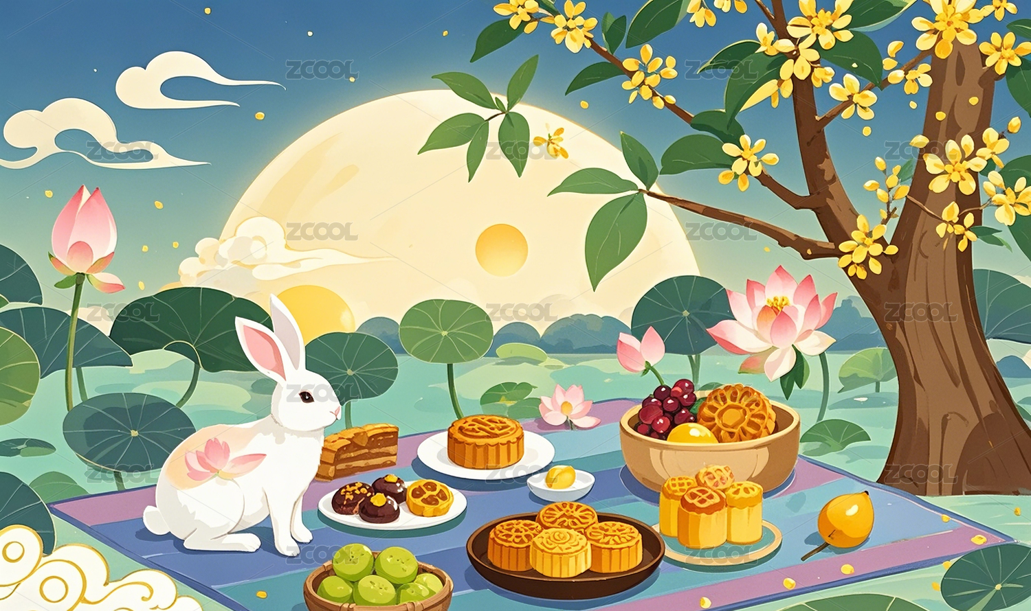 中秋节,荷花,月饼,玉兔,插画,中秋节插画,传统节日,月亮,中国风,国潮