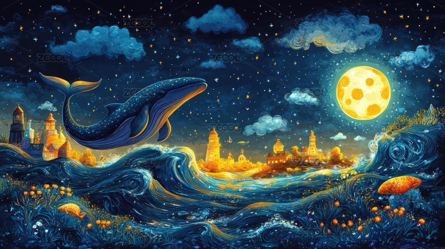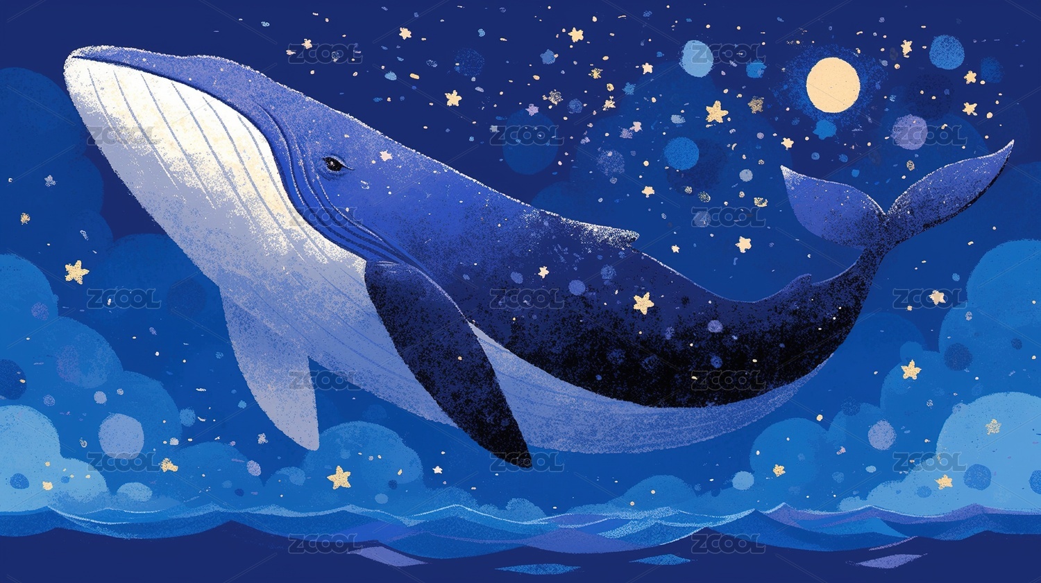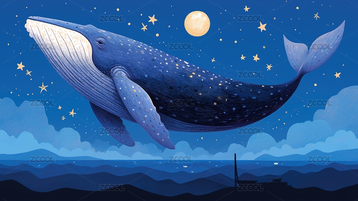 梦幻唯美线圈月球海洋生物鲸鱼手绘插画