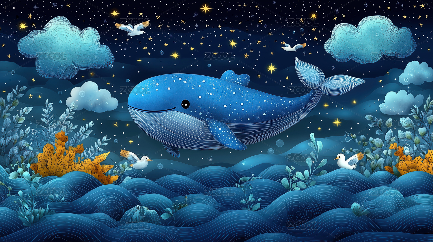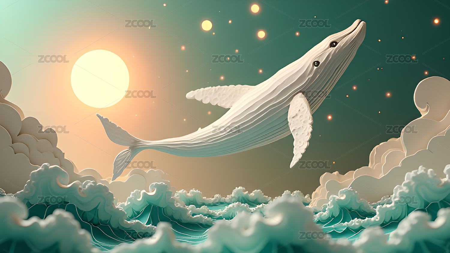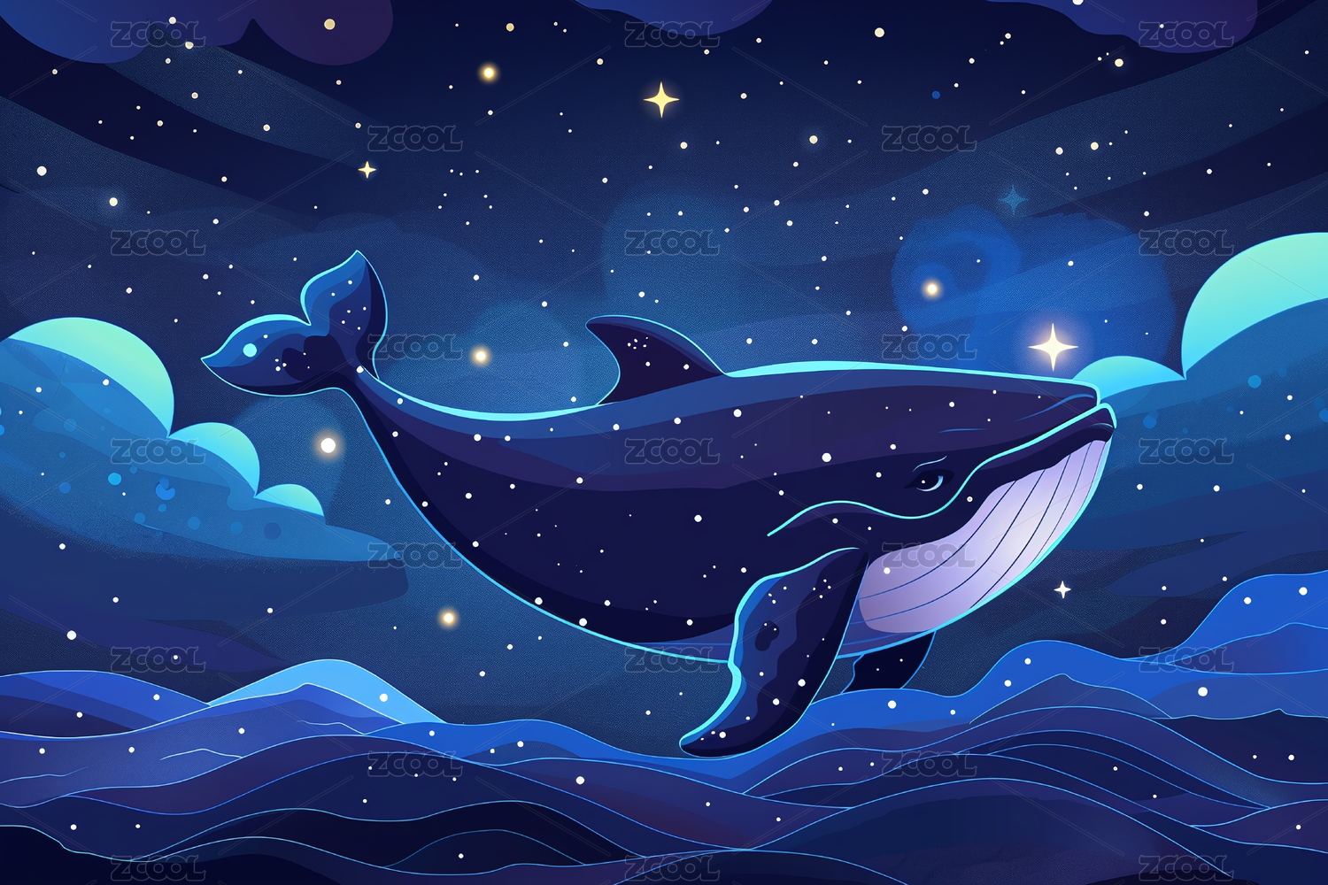 梦幻唯美线圈月球海洋生物鲸鱼手绘插画