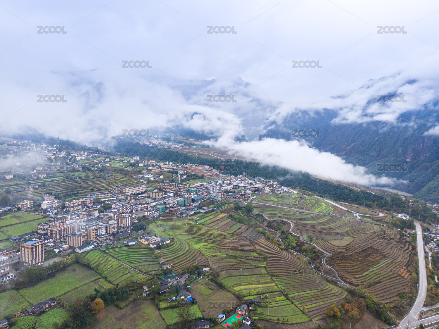 航拍四川青城山积雪的山峰和山谷中的村镇