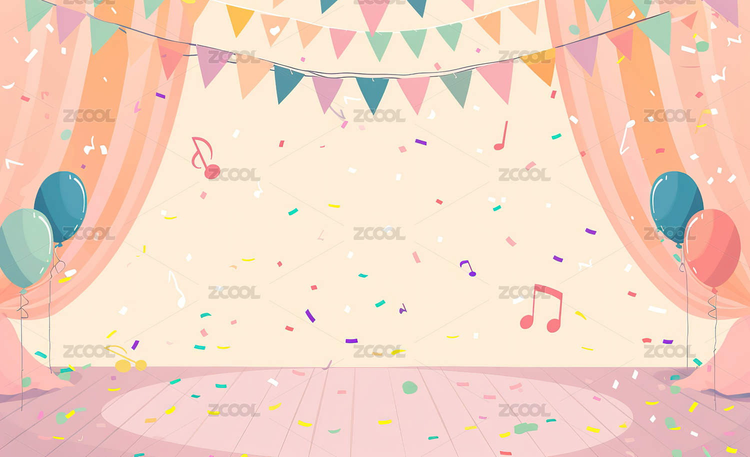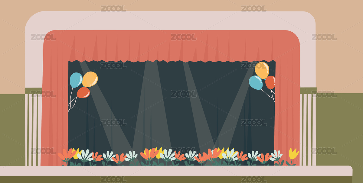 剧场舞台背景鲜花气球扁平矢量插画横版无字