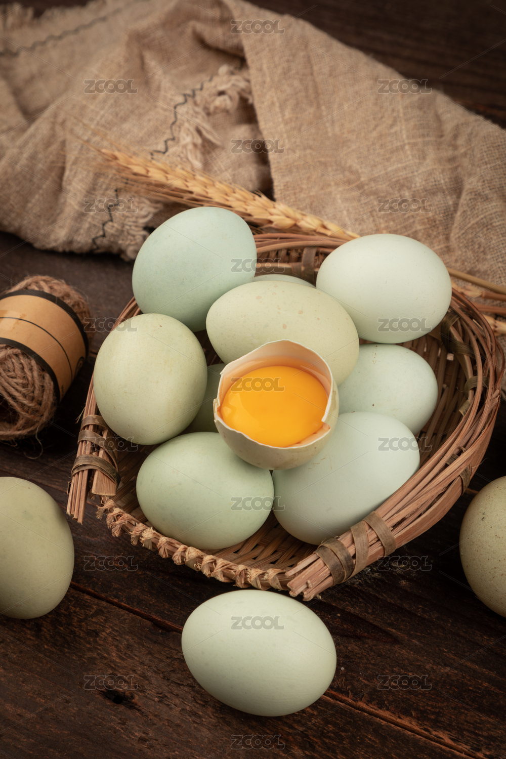 竹筐中放在草上的一窝农家绿皮土鸡蛋