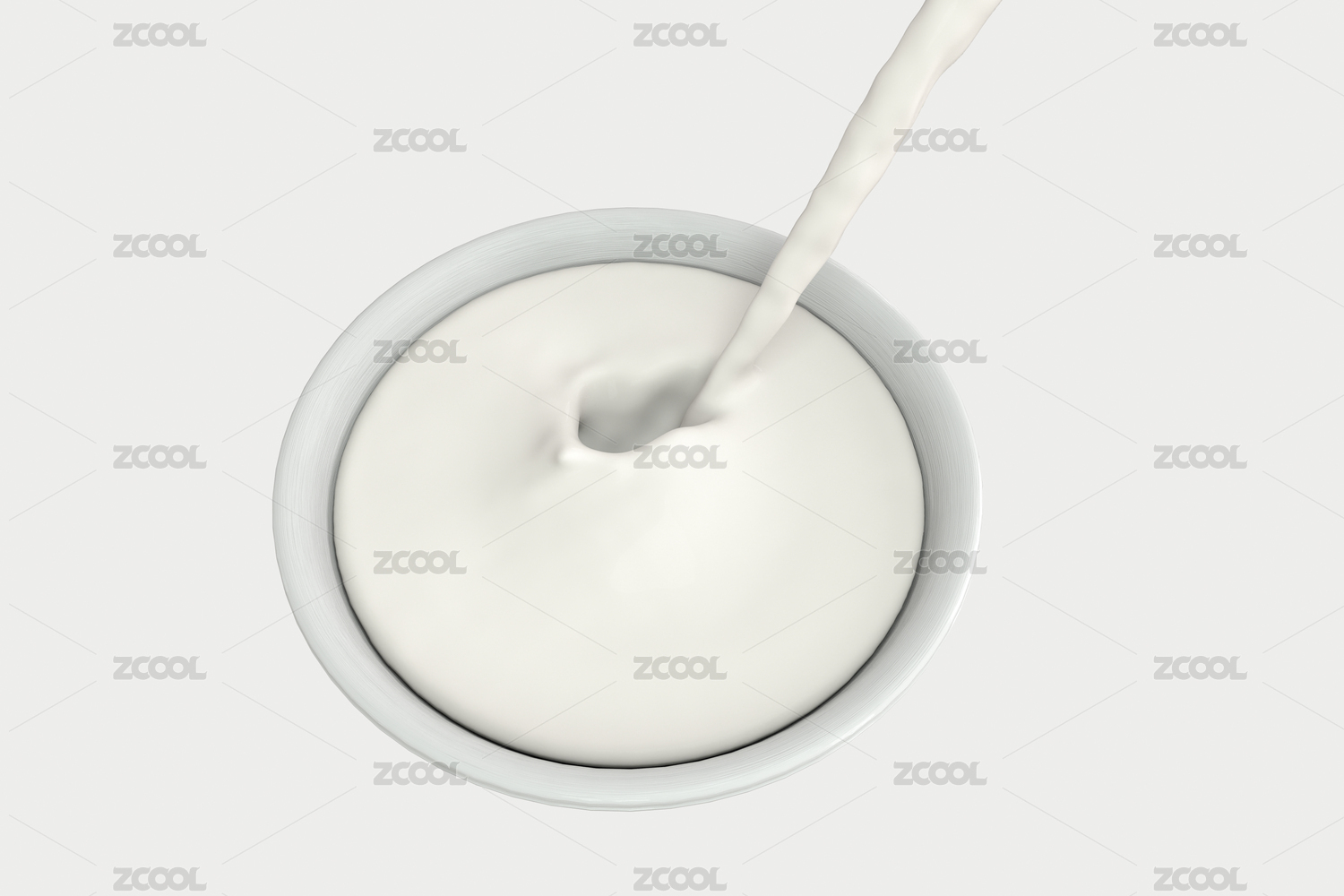 一碗牛奶与正在倾倒的液体,三维渲染