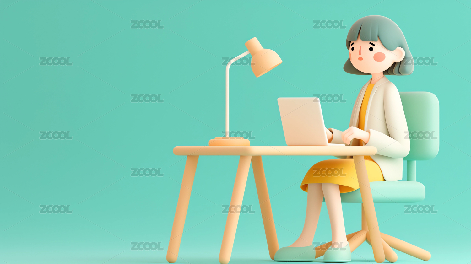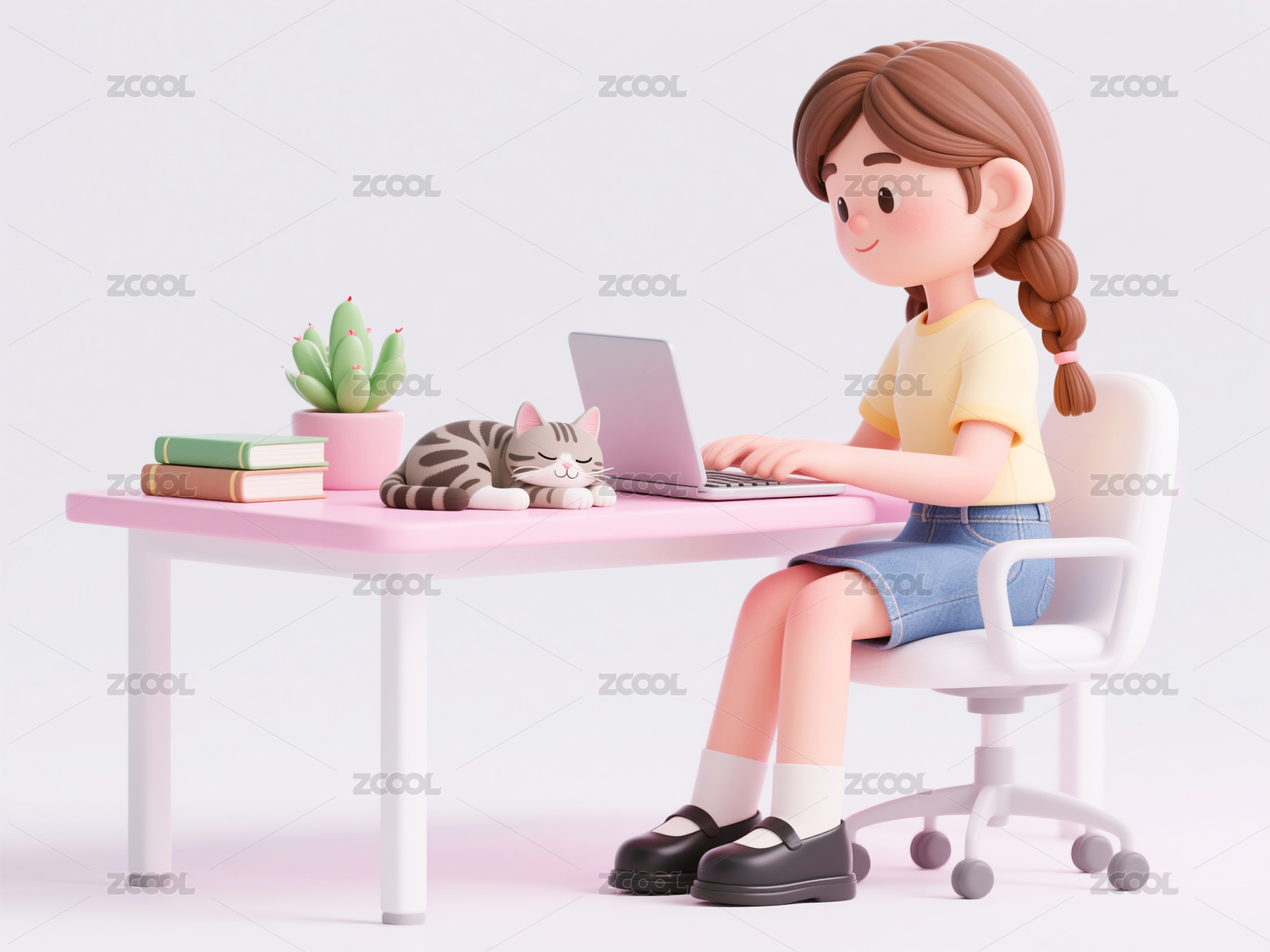 坐在桌前办公的卡通女孩3D渲染