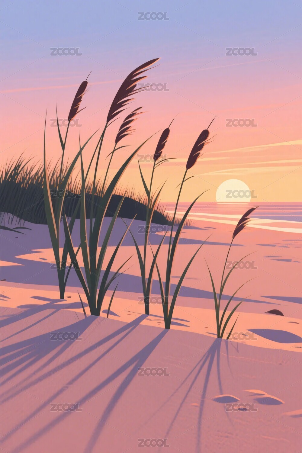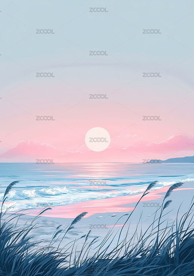 沙滩草丛日落插画