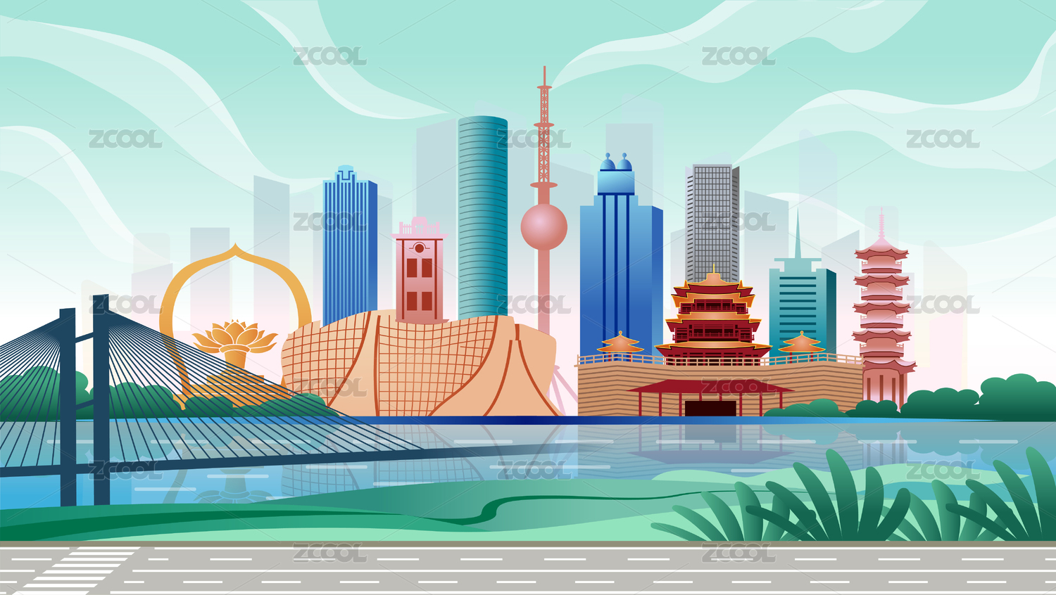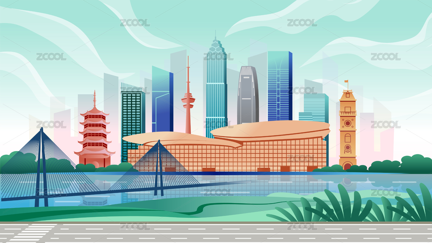 中国广东东莞市国风商务科技城市彩色插画