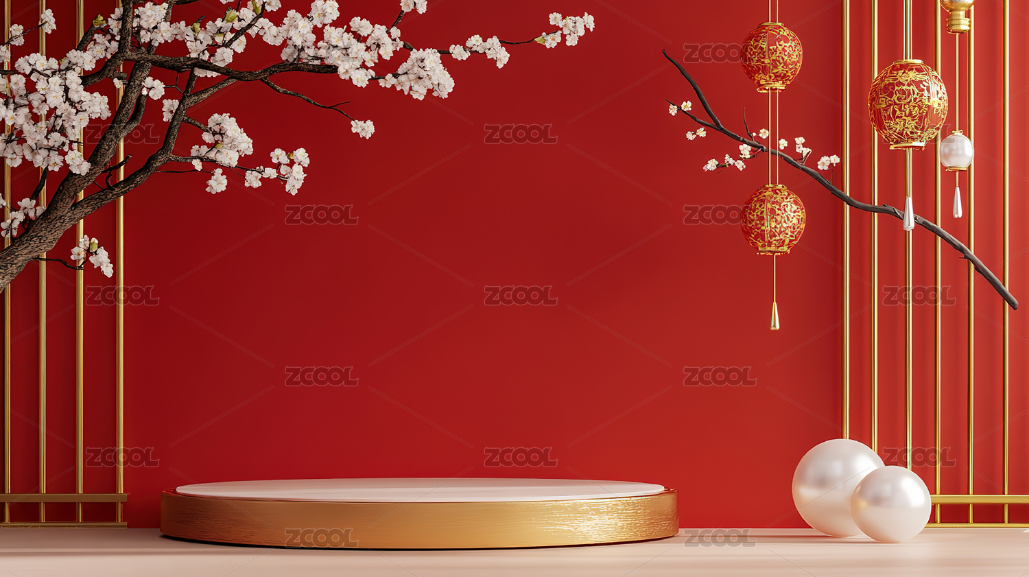 中国风,红色,金色,灯笼,梅花,展台,电商,促销,新年,节日