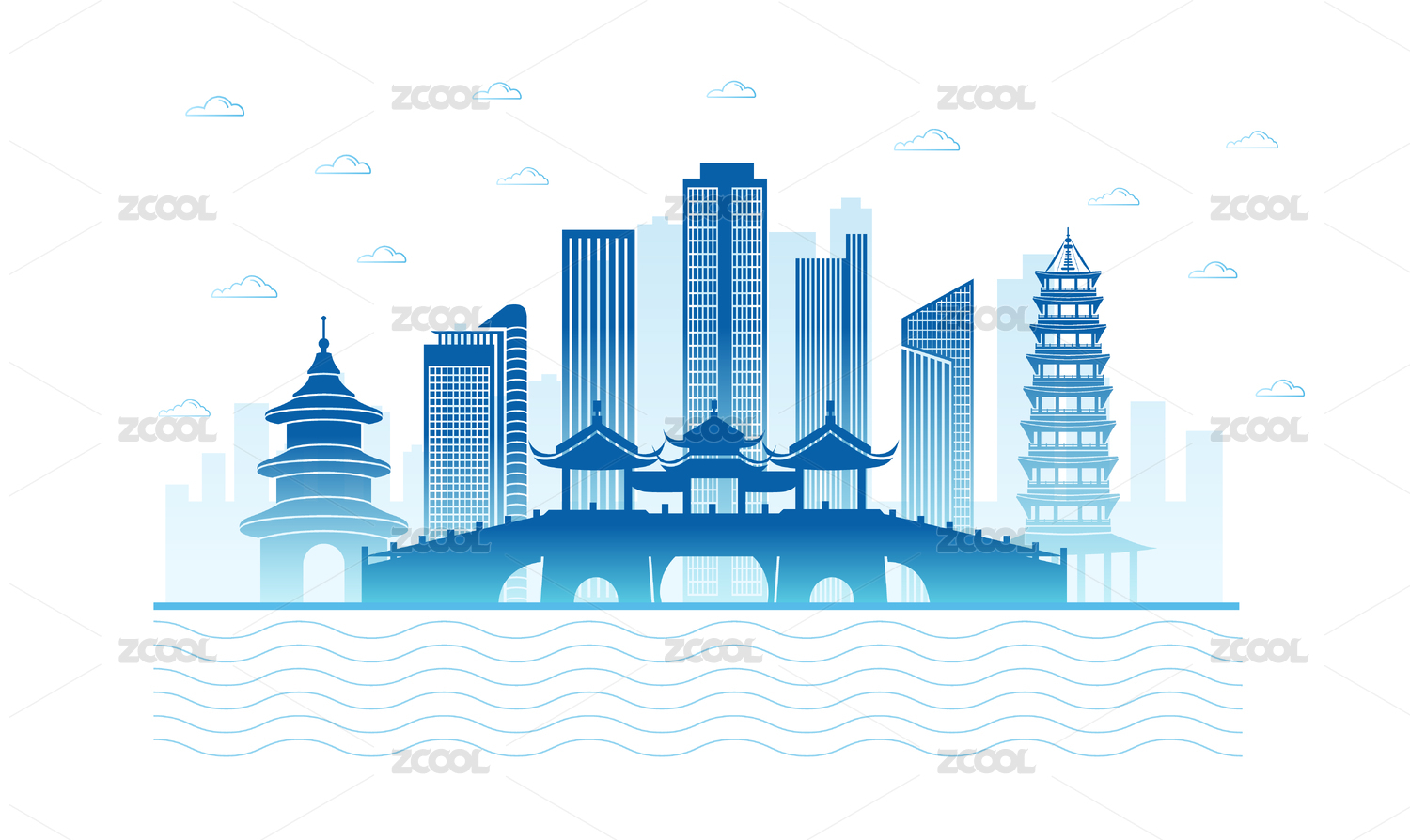 中国浙江省嘉兴市城市剪影矢量插画蓝色