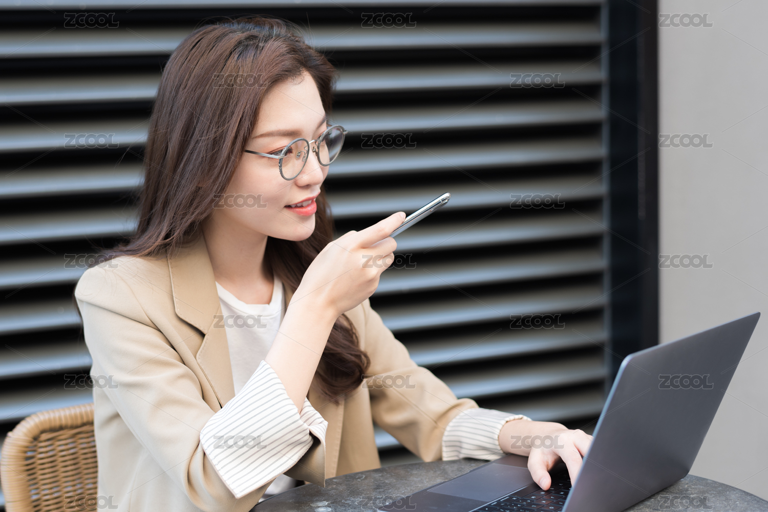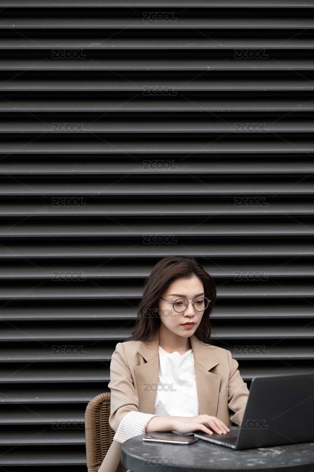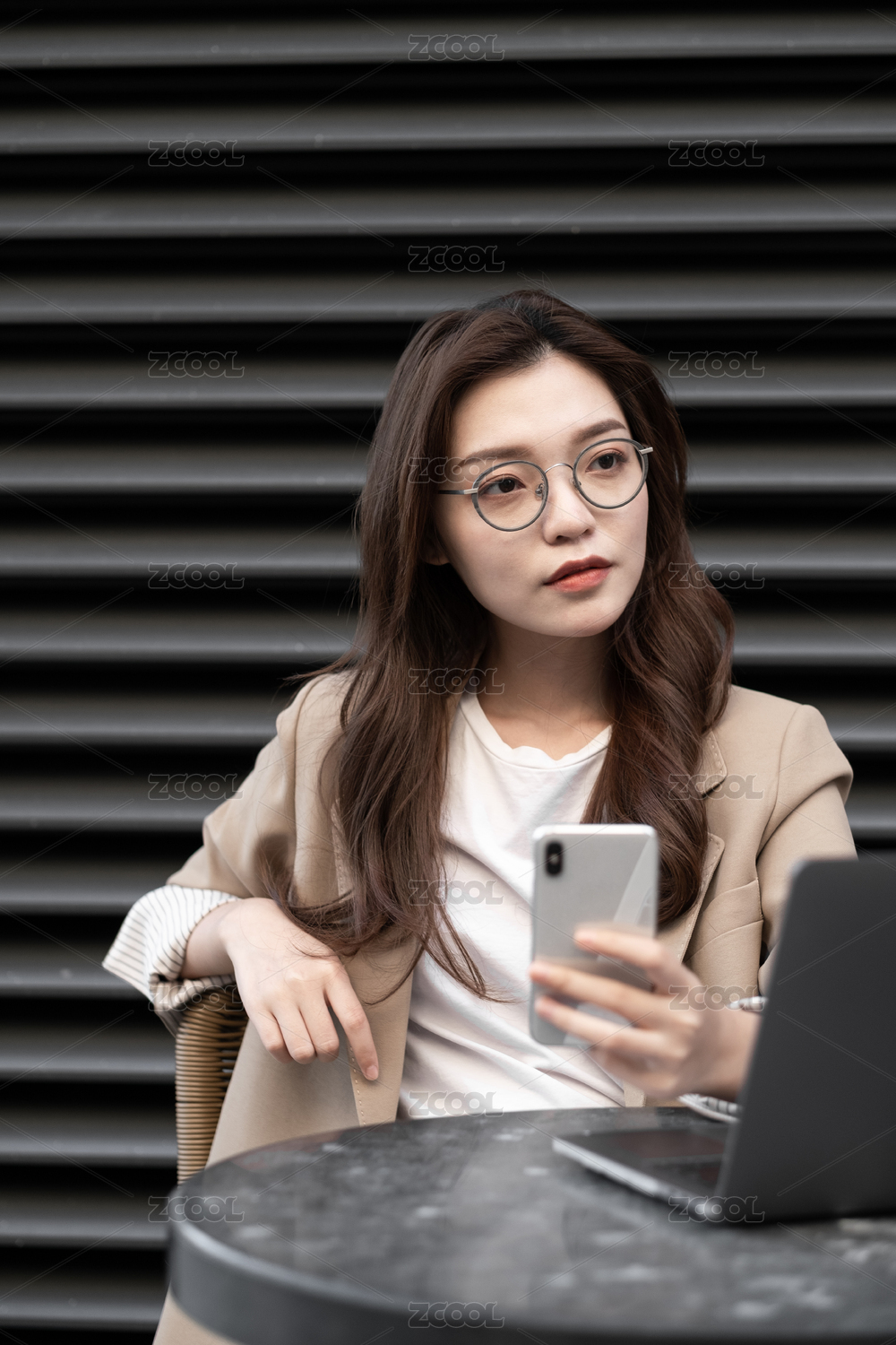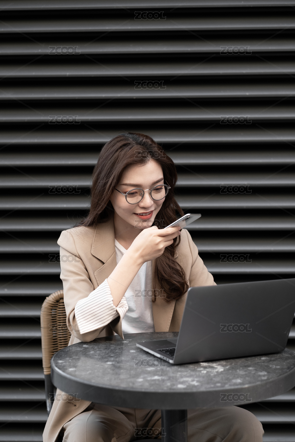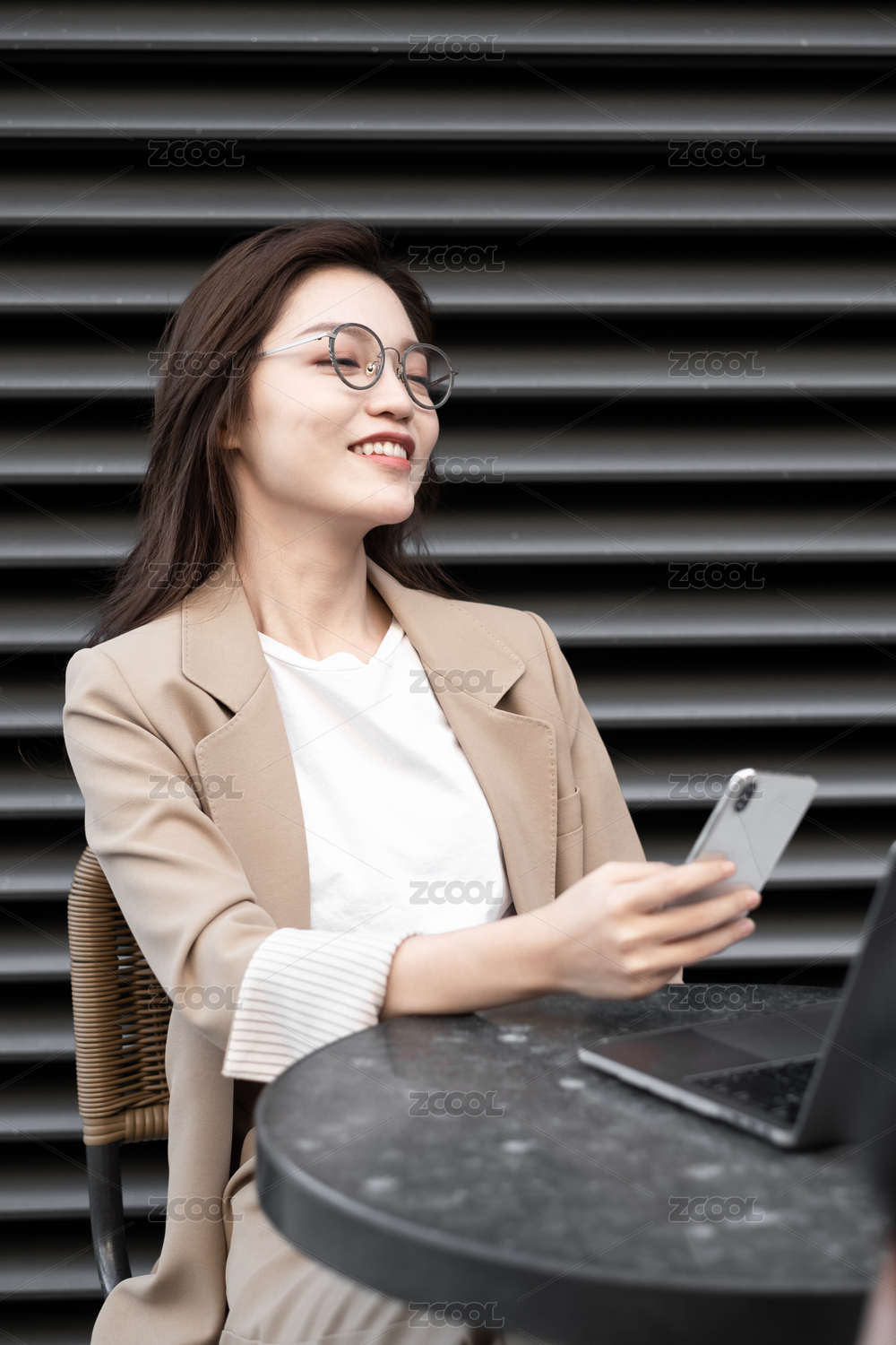 东方职业女性在室外坐在椅子上发信息