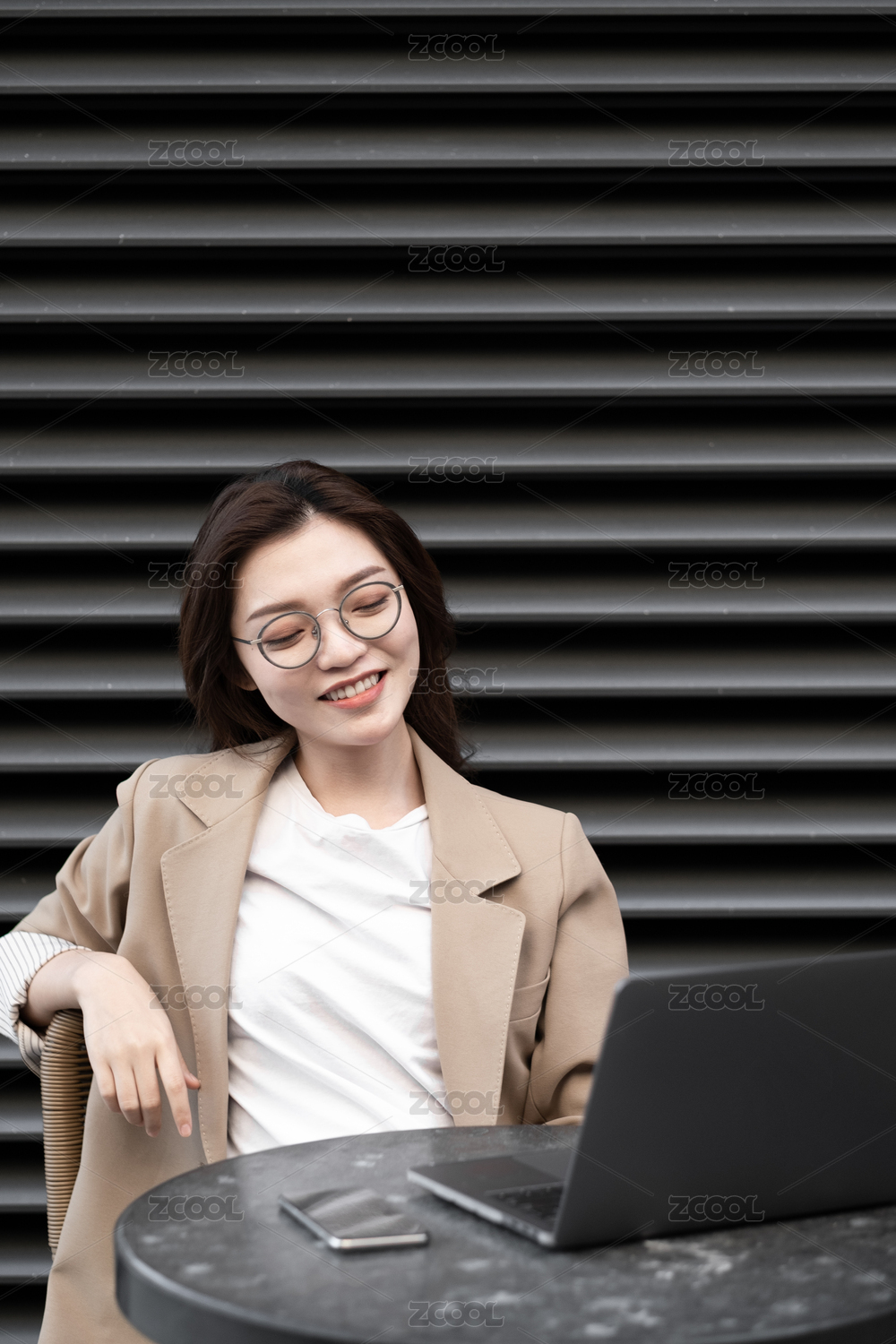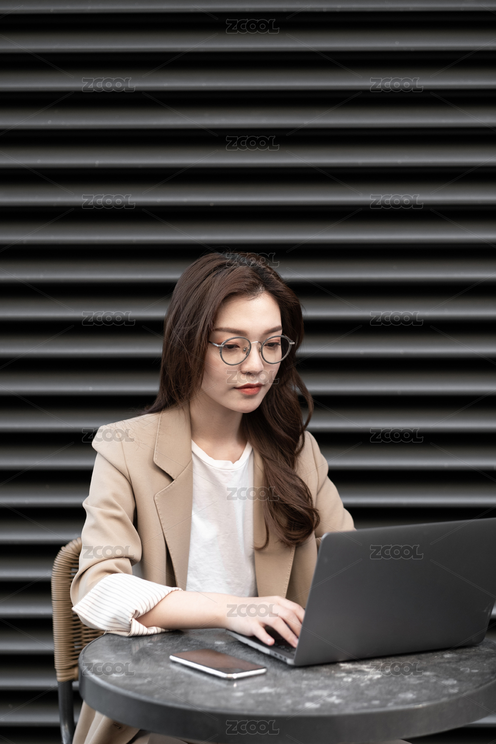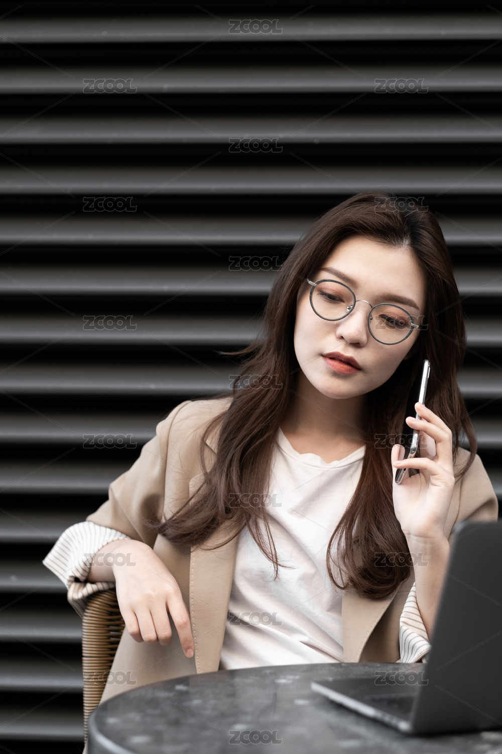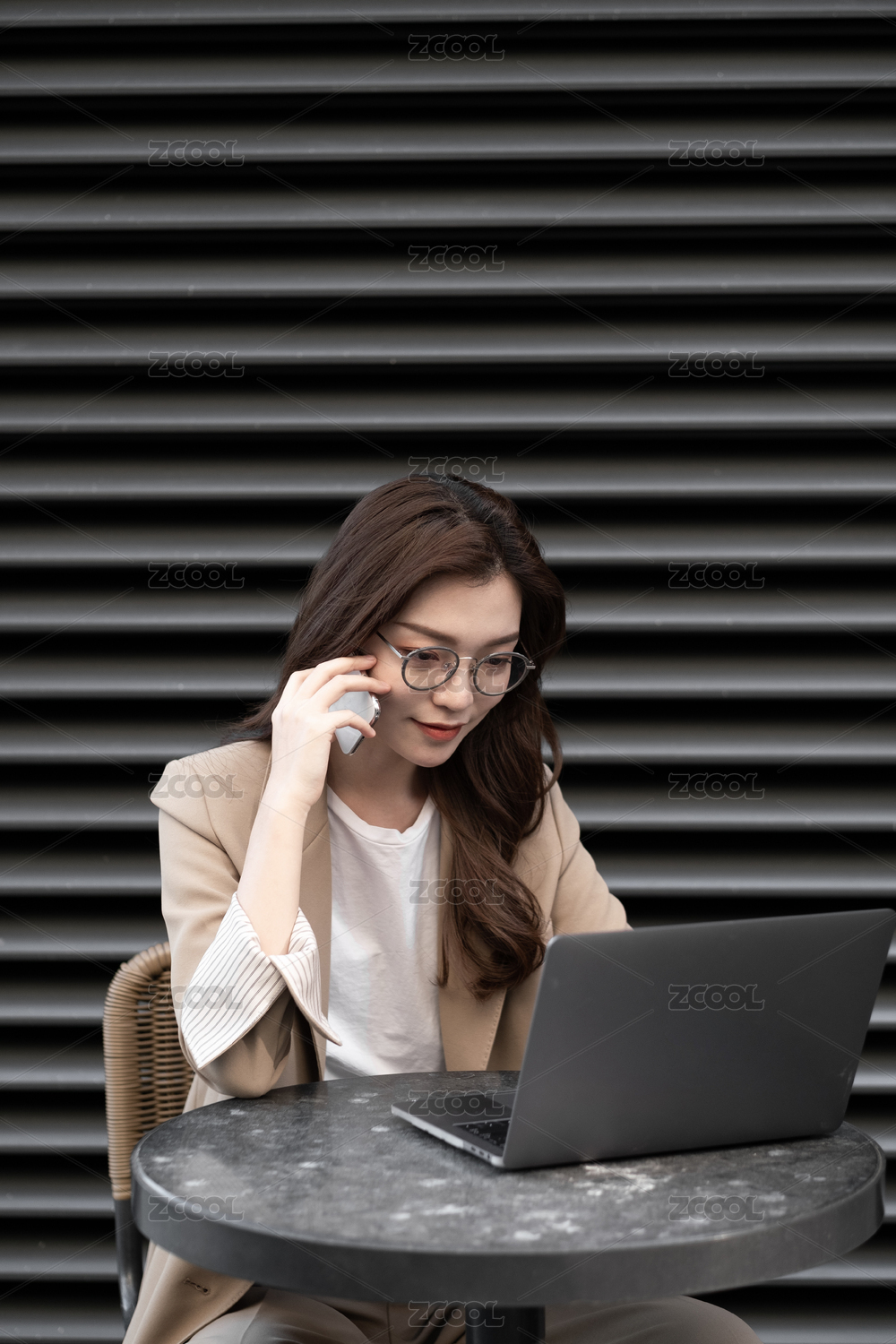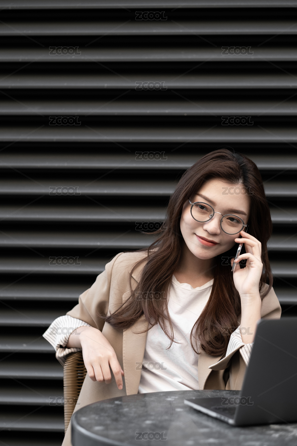 东方职业女性在室外坐在椅子上发信息