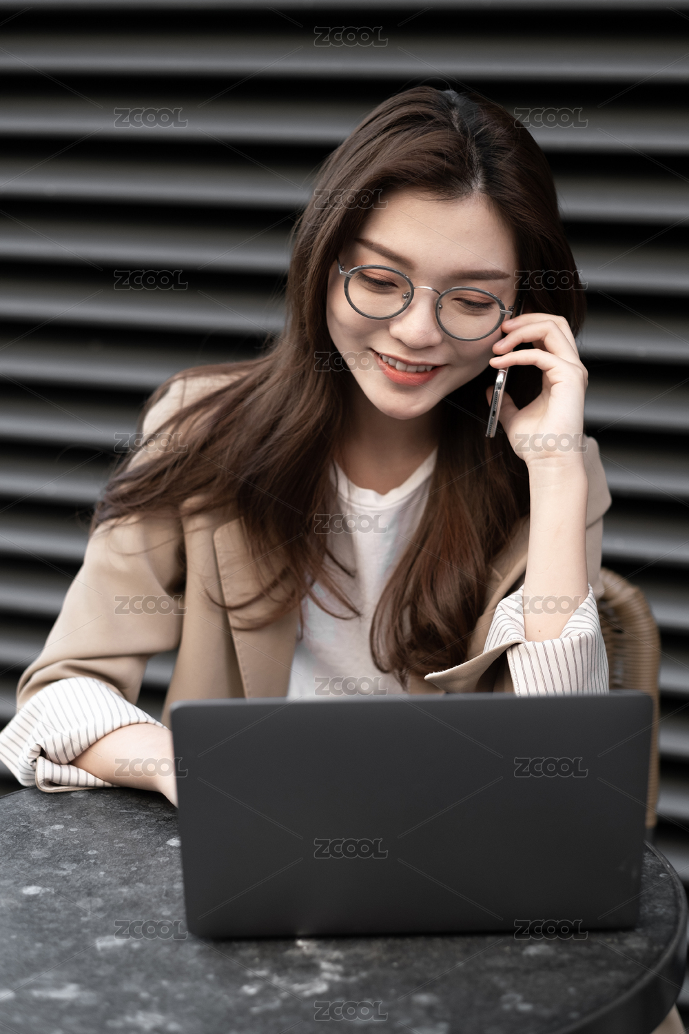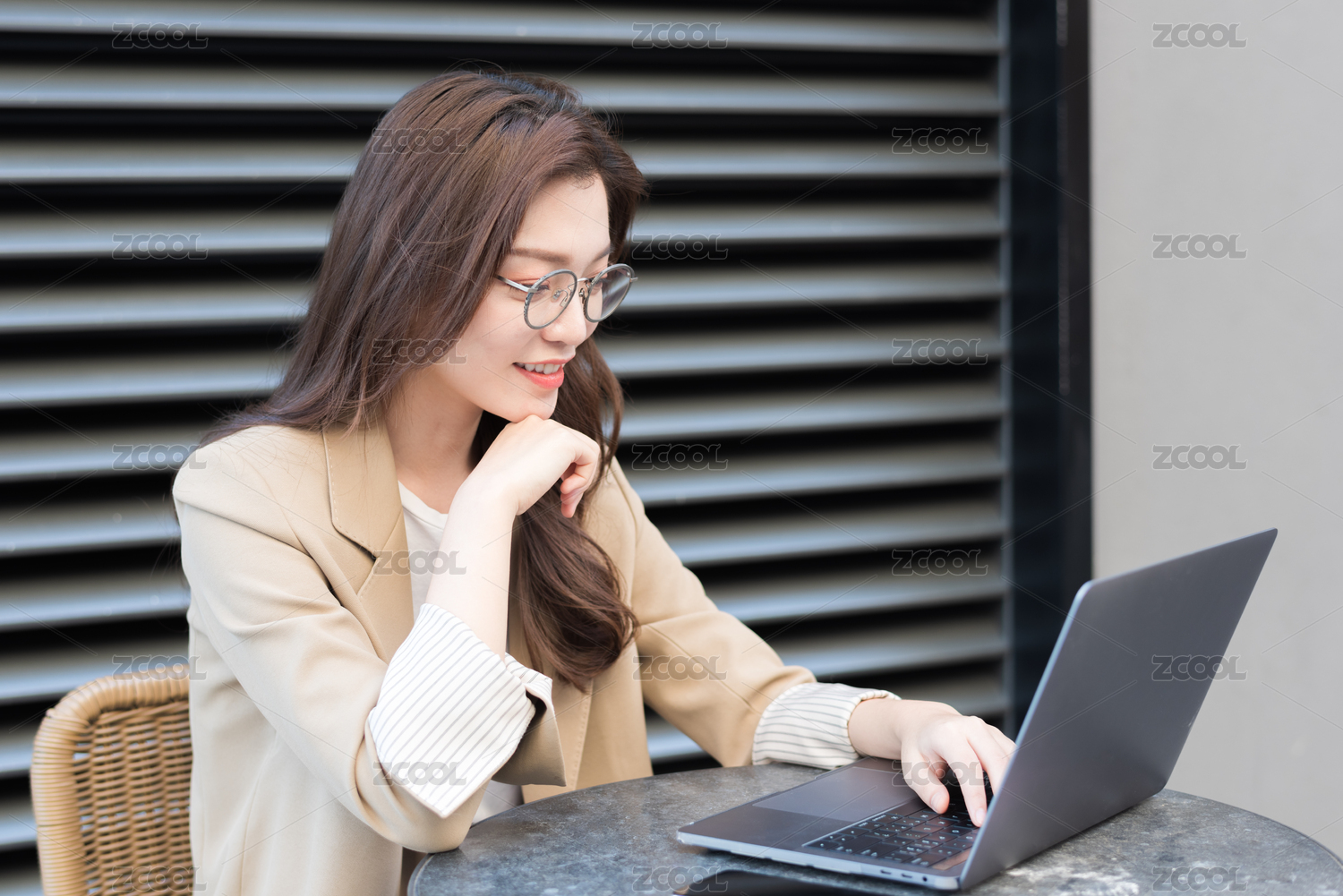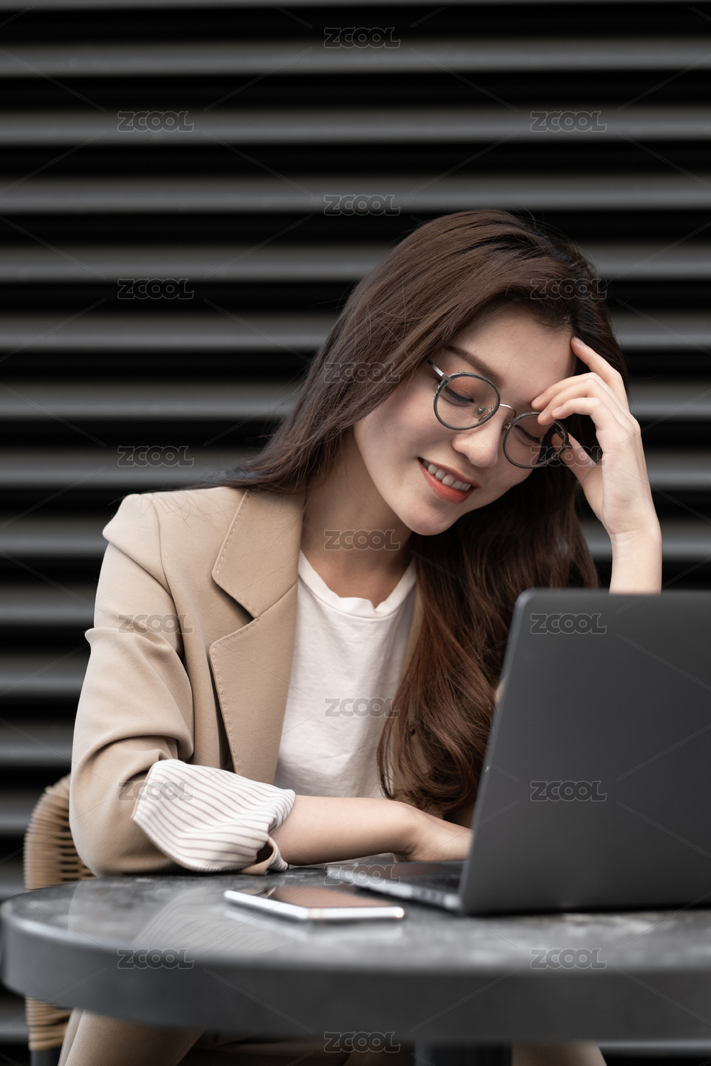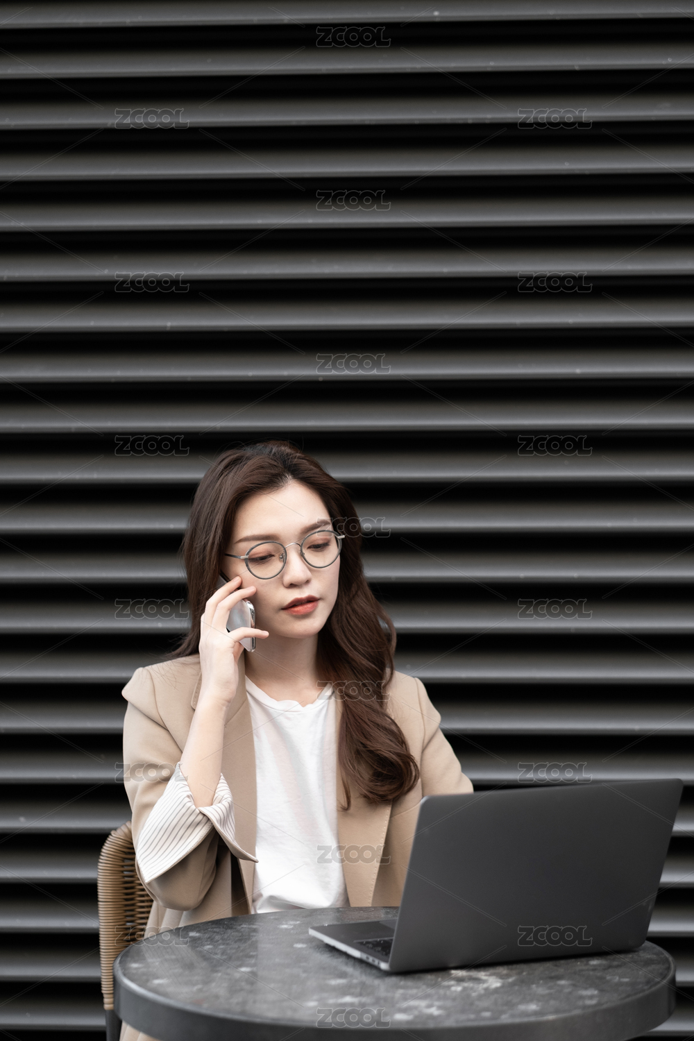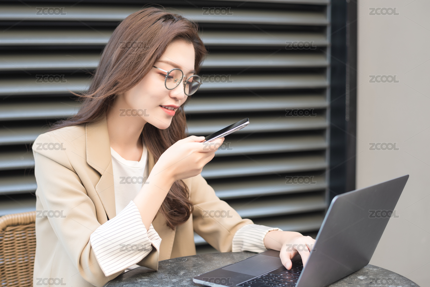 东方职业女性在室外坐在椅子上发信息