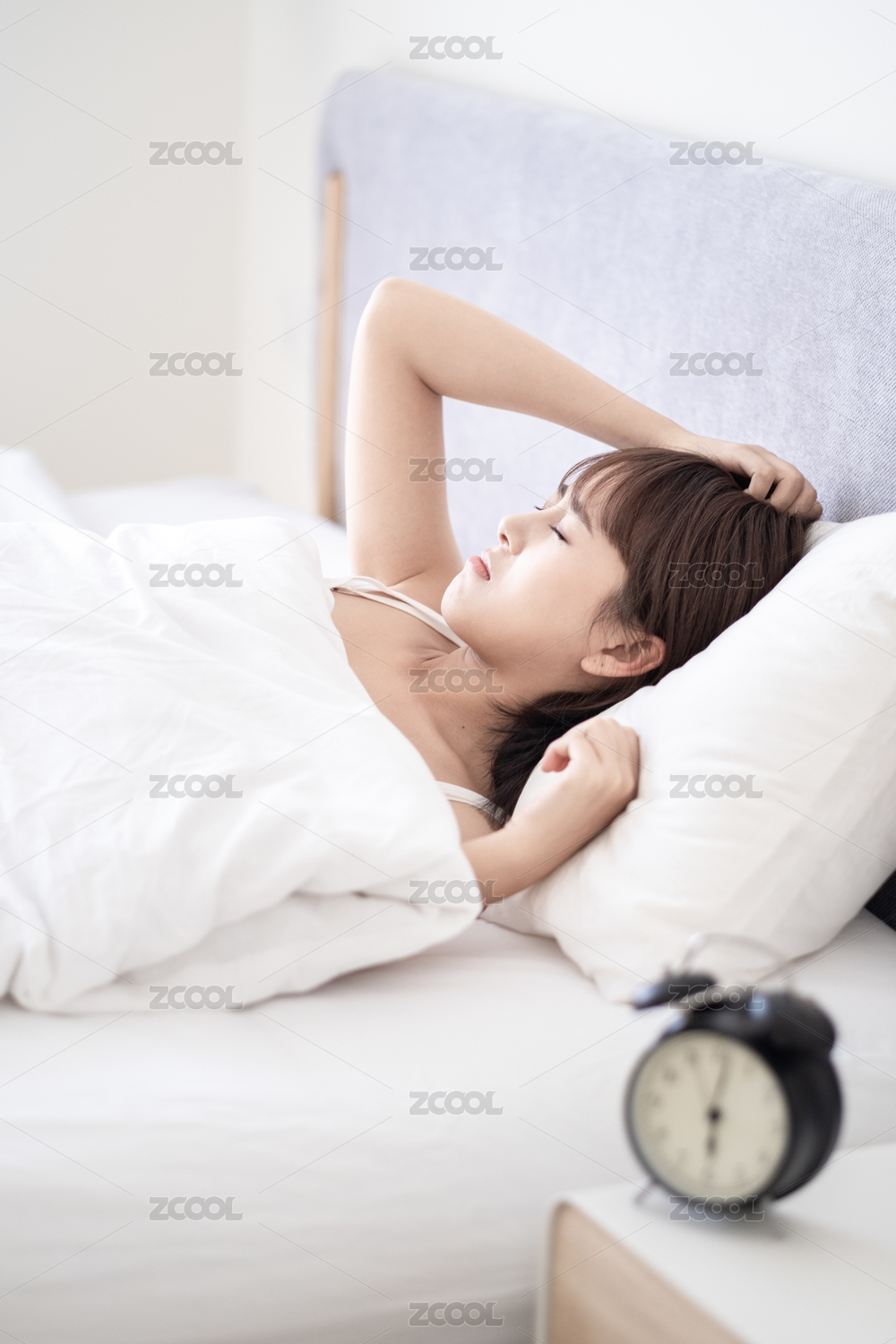 一名年轻漂亮的女性坐在床上烦躁的抱着头