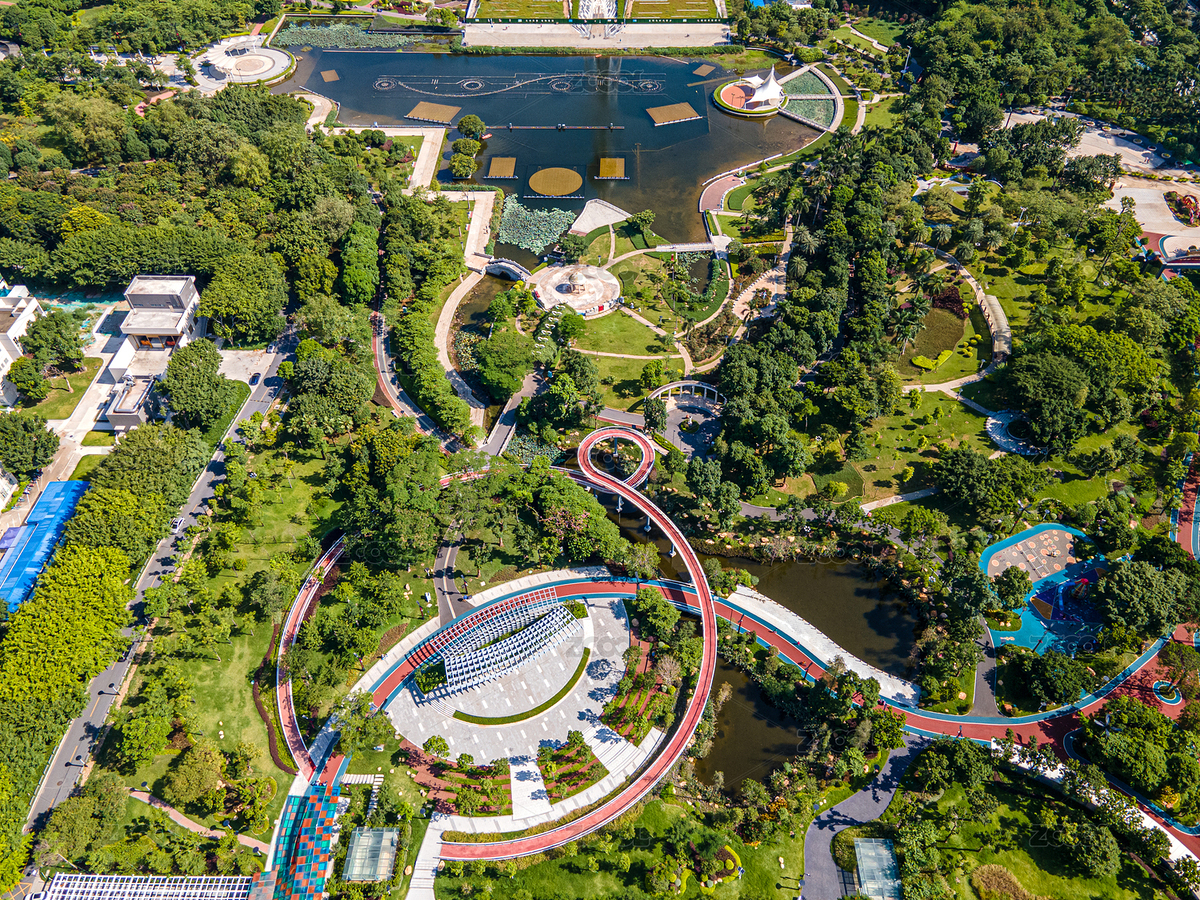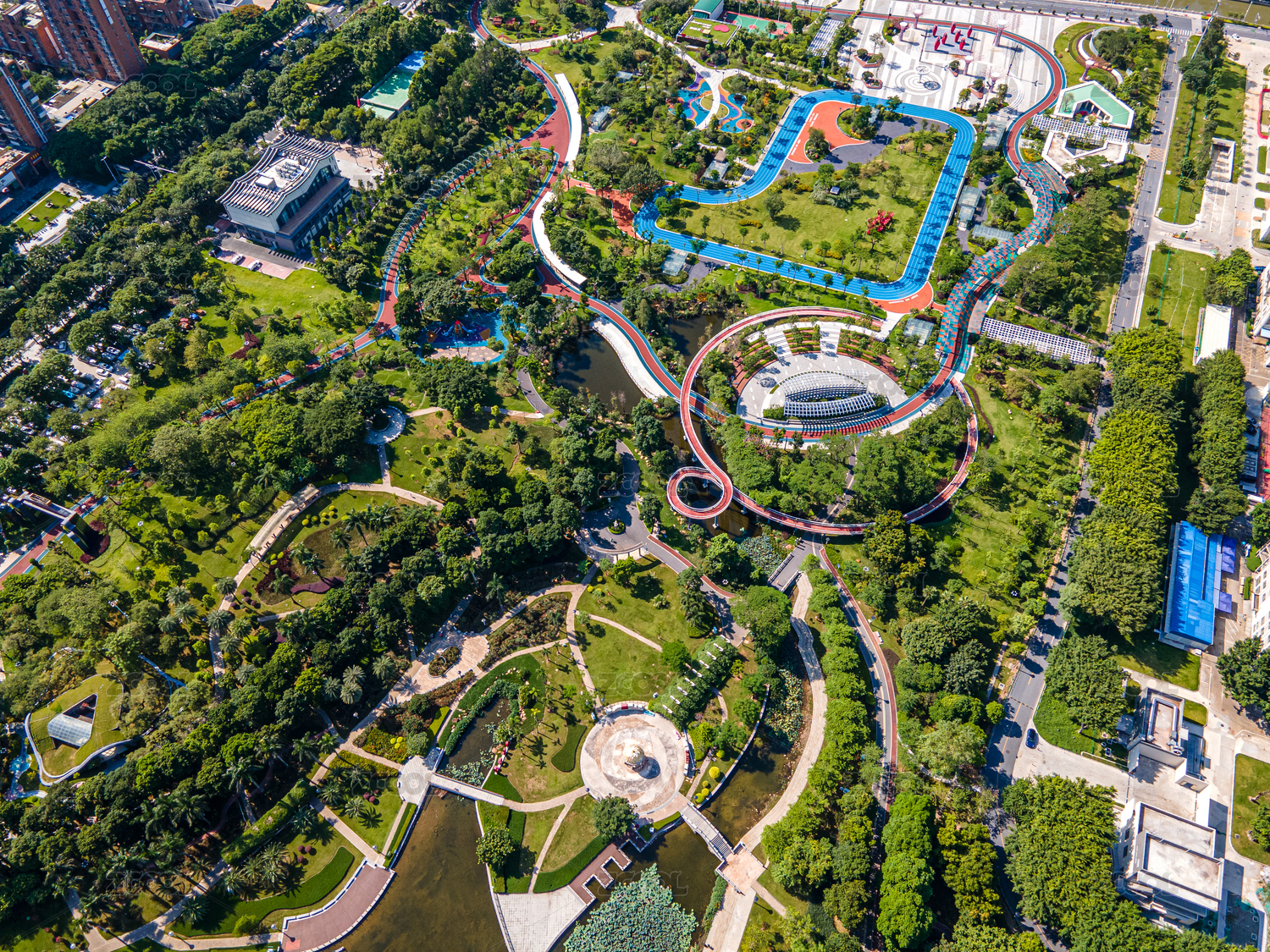 航拍东莞麻涌华阳湖湿地公园里的健身小路