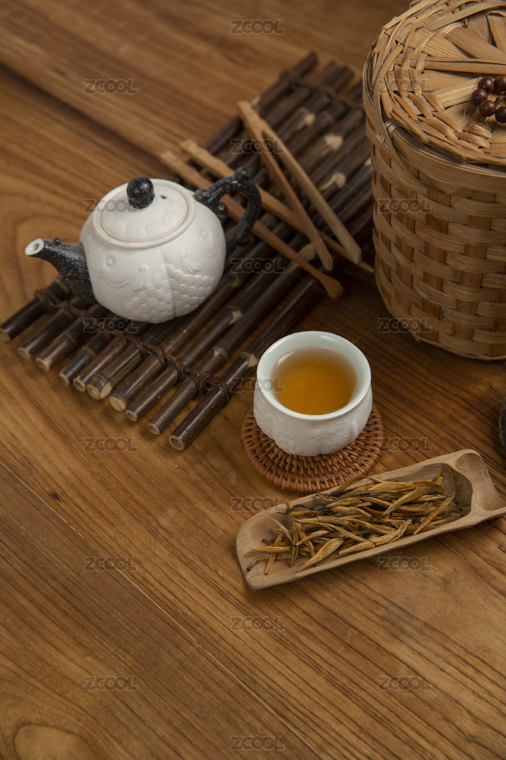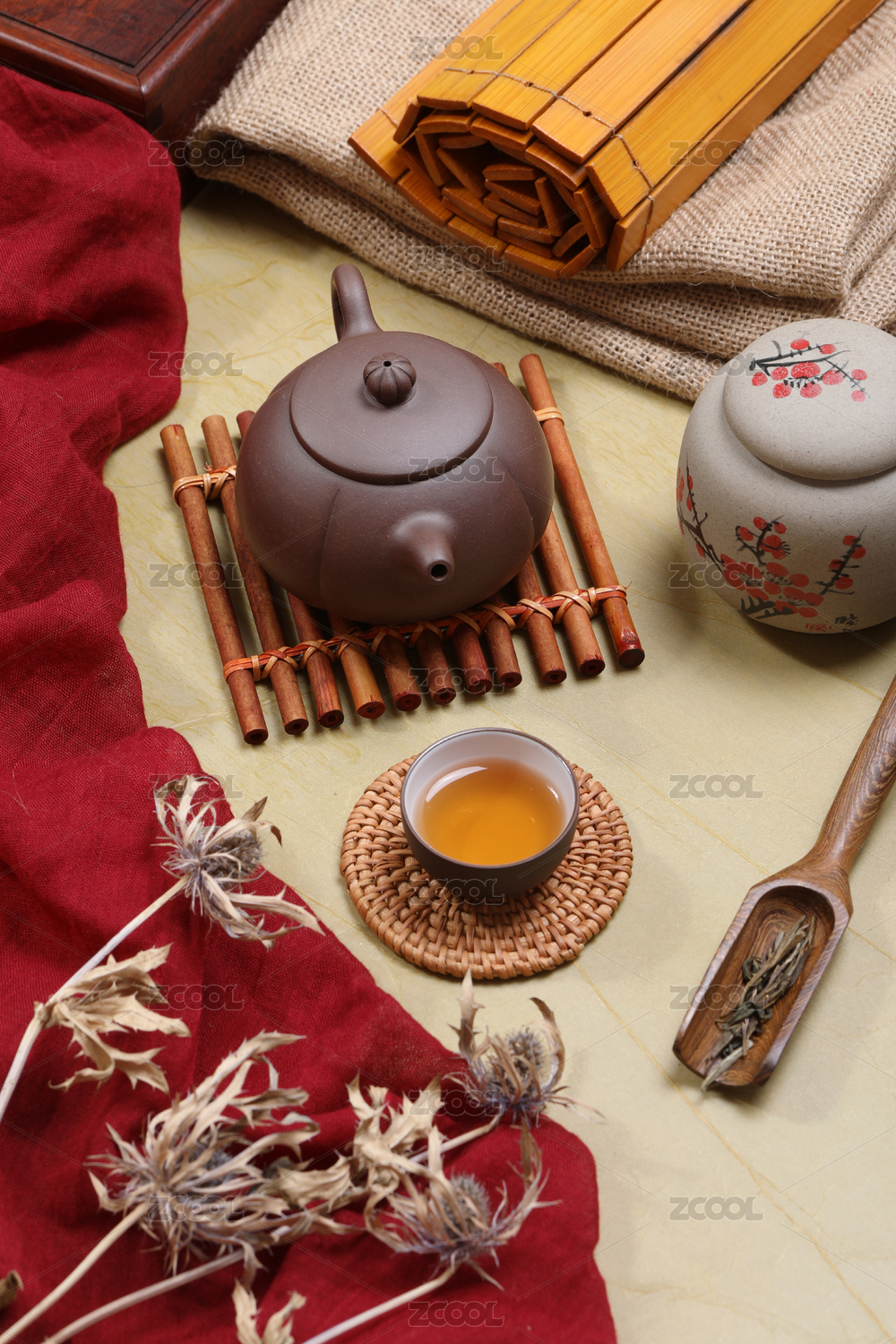 木色背景上的中国茶茶道茶文化