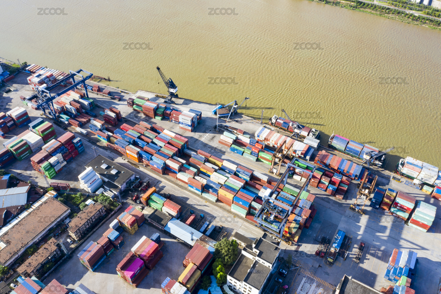 航拍货运码头的集装箱和起重机