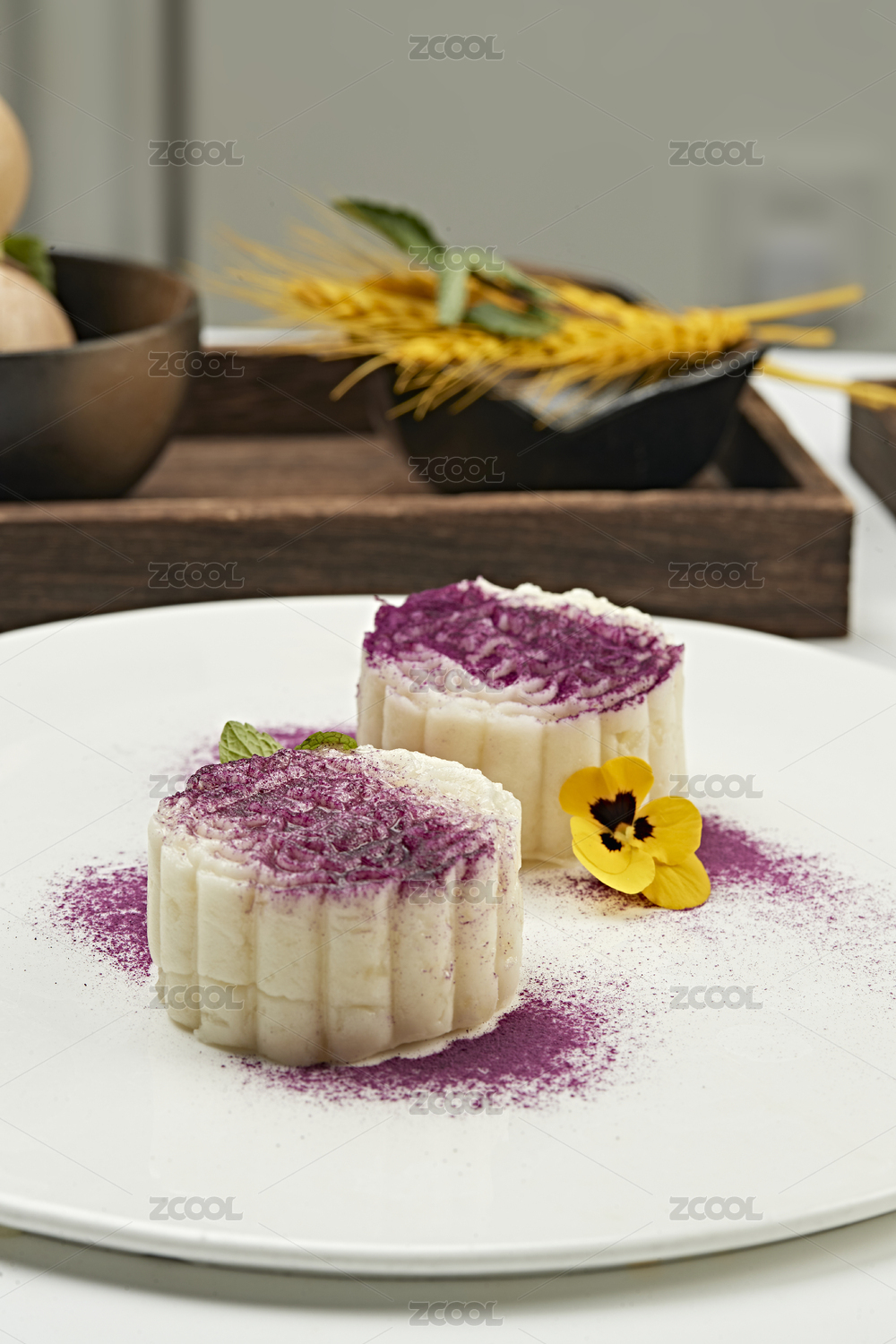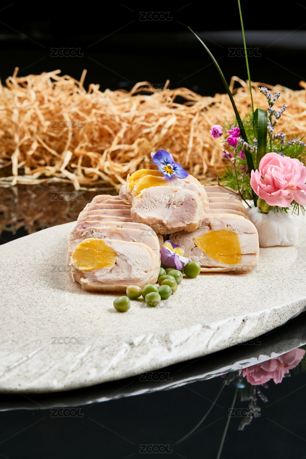 精美餐具装的鸡胸肉压咸蛋黄切片